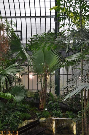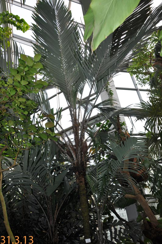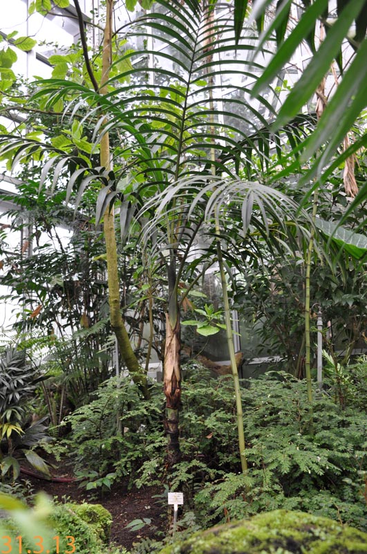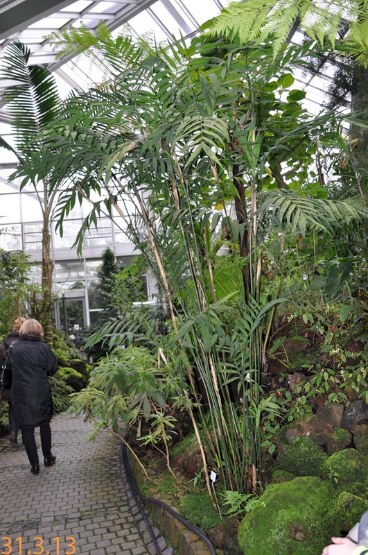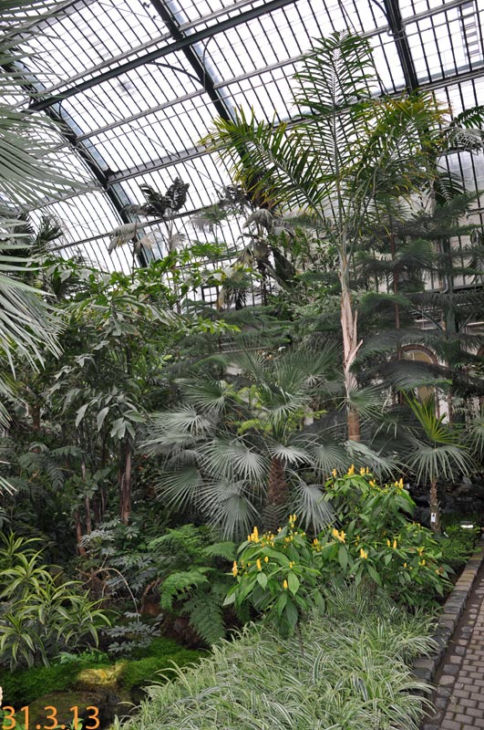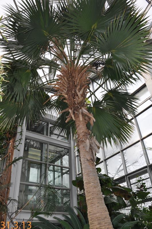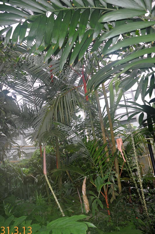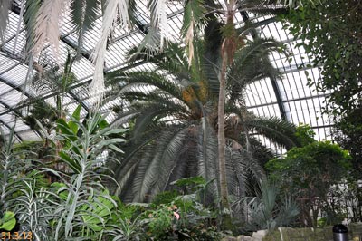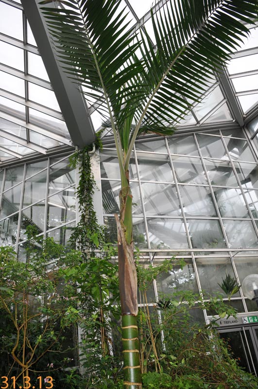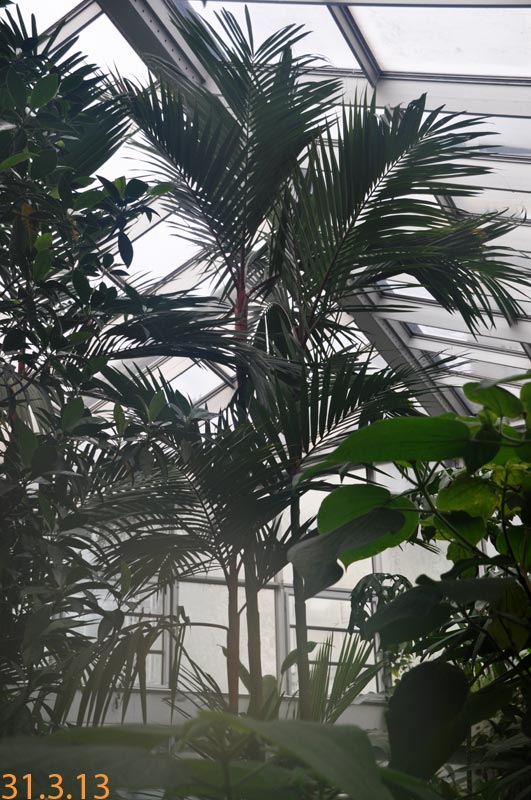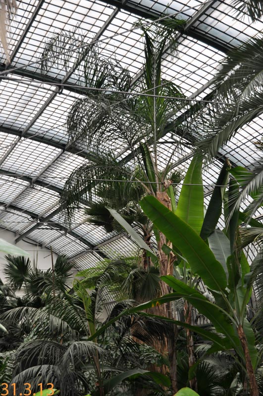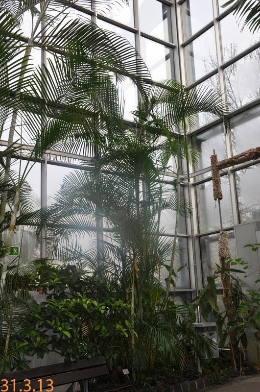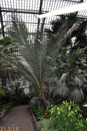 Besuch im Palmengarten FrankfurtLeider hatten wir nur knapp zwei Stunden Zeit für unseren kleinen Abstecher zum Palmengarten in Frankfurt, aber es hat sich dennoch gelohnt, denn dieser Palmengarten ist allemale einen Besuch wert. Da wir nur wenig Zeit hatten, mussten wir natürlich einen "Schnelldurchlauf" machen, aber dennoch bekamen wir viel Interessantes zu sehen und vor allem Appetit, so dass wir sicher noch einmal mit etwas mehr Zeit wiederkommen werden. Bei düsterem kalten und windigem Wetter kamen wir nachmittags in Frankfurt an. Die Trachies auf der Wiese vor dem Eingang machten einen recht mitgenommenen Eindruck, obwohl der Winter ja nicht sonderlich kalt war. Jedenfalls hatten die Trachies nur sehr spärliche Kronen. Die Vorgeschichte dieser Trachies kenne ich leider nicht. So, nun aber einige Bilder aus den verschiedenen Palmenhäusern... Xeronema callistemon Zwischen den Palmen gab es natürlich auch unzählige andere Pflanzen wie u.a. auch Palmfarne, Baumfarne etc.. Insbesondere die Palmfarne haben es mir sehr angetan. Schon lange spiele ich mit dem Gedanken mir einige Palmfarne zu besorgen um auch die mal ausgepflanzt im Garten zu probieren. Leider gibt es nur se wenige Erfahrungen in diesem Bereich, obwohl es einige Gattungen und Arten gibt, die durchaus mal einen Versuch wert wären. Leider sind größere Palmfarne recht schwierig zu bekommen und auch recht teuer. Jungpflanzen wachsen meist recht langsam. Besonders die "Brotpalmfarne" Encephalartos haben es mir schon lange angetan... Encephalartos lebomboensis Cycas thouarsii Trithrinax acanthocoma S. palmetto Ein Hingucke den ich bisher nur von Bildern kannte. Die Doum-Palme Hyphaene thebaica Sehr grüne Bismarckia nobilis. Bin mir nicht sicher ob es die grüne Form ist, oder ob die grünen Blätter mit der Gewächshaushaltung zu tun haben. Die Petiolen waren interessanter Weise silberblau. Beeindruckende Goldfruchtpalmen (Dypsis lutescens), die noch als Chrysalidocarpus lutescens beschriftet sind. Ein äußerst stacheliger Geselle, den ich bisher nicht kannte. Die Sternusspalme Astrocaryum mexicanum Sehr schöne Burretiokentia hapala Pelagodoxa henryana Sehr schöne Latania loddigesii. Eine Jungpflanze, an der man noch die roten Ränder an Blättern und Petiolen erkennt und daneben eine adulte Pflanze die deutlich macht warum diese Palme "Blaue Latanpalme" heißt. Eine wunderschöne Palme! Pritchardia lanigera Salacca zalacca Elaeis guineensis - Afrik.Ölpalme Prestoea acuminata Kentiopsis olivaeformis Sieht aus wie eine Palme, ist aber keine: Carludovica palmata, die "Panamahutpalme" aus der Familie der Scheibenblumengewächse (Cyclanthaceae) So, natürlich gab es noch einiges mehr zu sehen, allerdings reichte dafür unsere Zeit nicht aus. Aber eines ist klar - ich werde sicher nochmal wiederkommen und mehr Zeit mitbringen...
