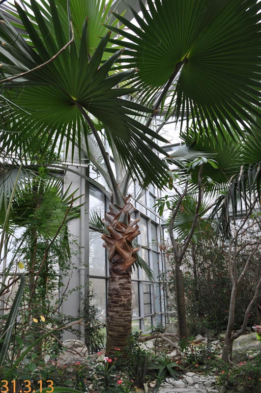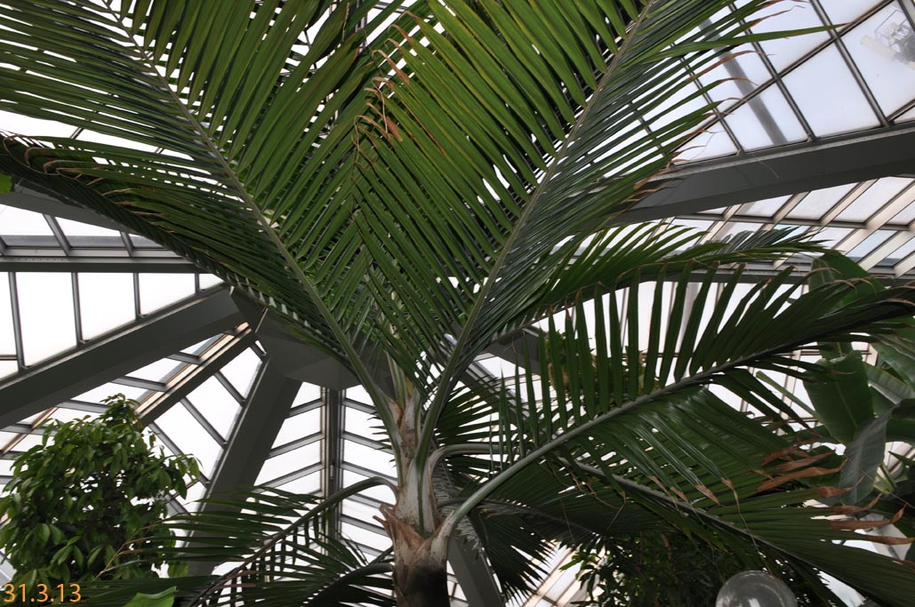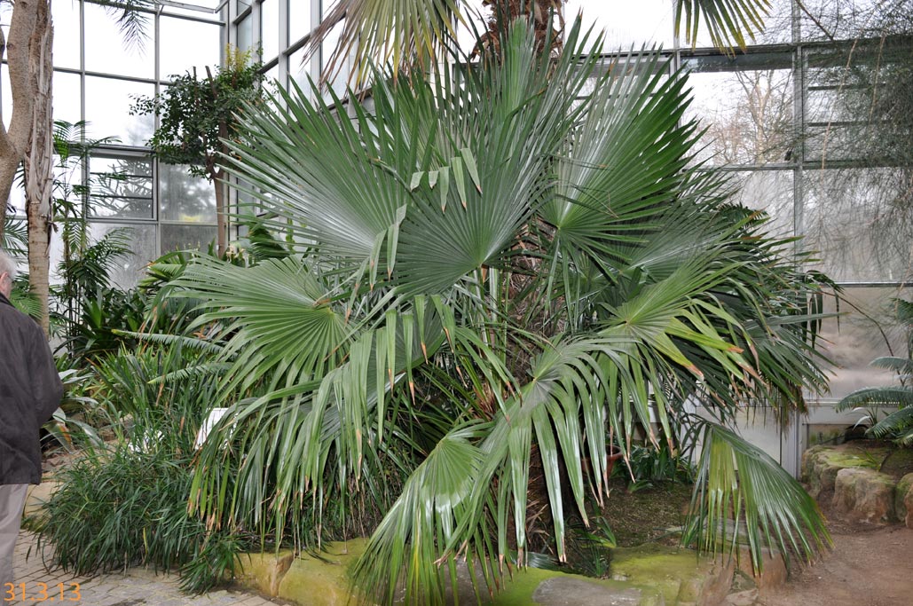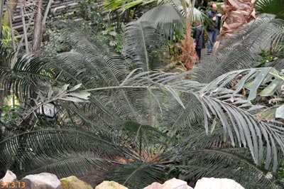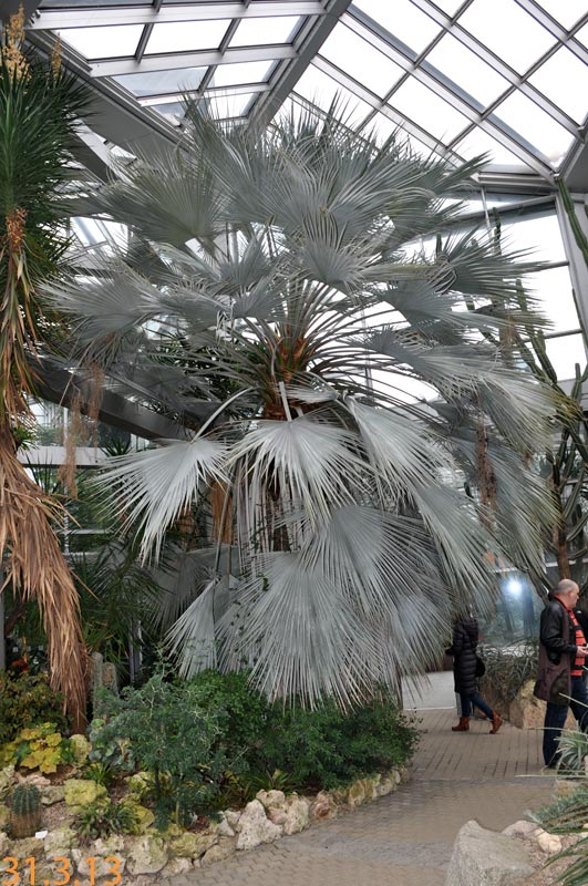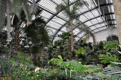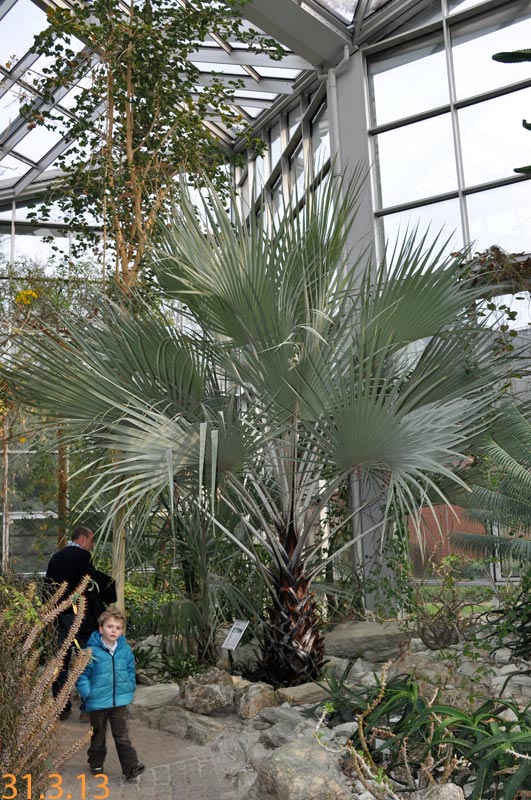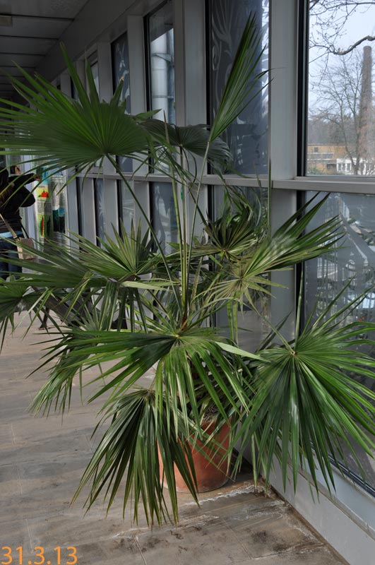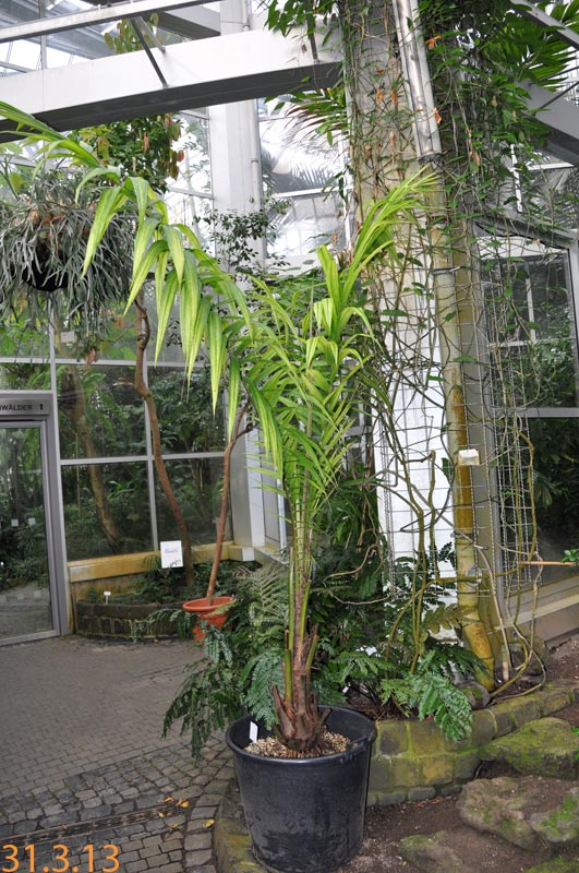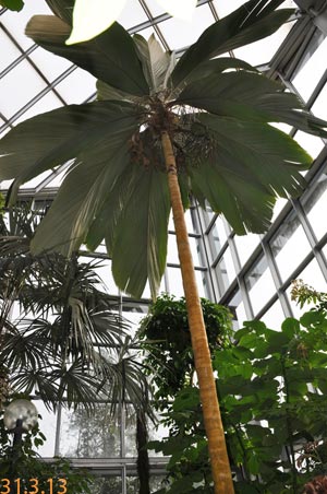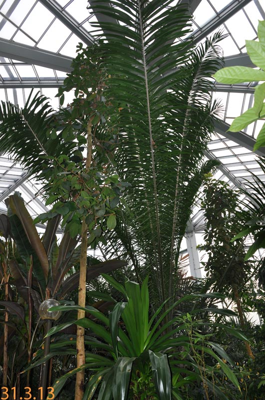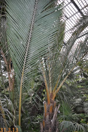 Besuch im Palmengarten FrankfurtLeider hatten wir nur knapp zwei Stunden Zeit für unseren kleinen Abstecher zum Palmengarten in Frankfurt, aber es hat sich dennoch gelohnt, denn dieser Palmengarten ist allemale einen Besuch wert. Da wir nur wenig Zeit hatten, mussten wir natürlich einen "Schnelldurchlauf" machen, aber dennoch bekamen wir viel Interessantes zu sehen und vor allem Appetit, so dass wir sicher noch einmal mit etwas mehr Zeit wiederkommen werden. Bei düsterem kalten und windigem Wetter kamen wir nachmittags in Frankfurt an. Die Trachies auf der Wiese vor dem Eingang machten einen recht mitgenommenen Eindruck, obwohl der Winter ja nicht sonderlich kalt war. Jedenfalls hatten die Trachies nur sehr spärliche Kronen. Die Vorgeschichte dieser Trachies kenne ich leider nicht. So, nun aber einige Bilder aus den verschiedenen Palmenhäusern... Xeronema callistemon Zwischen den Palmen gab es natürlich auch unzählige andere Pflanzen wie u.a. auch Palmfarne, Baumfarne etc.. Insbesondere die Palmfarne haben es mir sehr angetan. Schon lange spiele ich mit dem Gedanken mir einige Palmfarne zu besorgen um auch die mal ausgepflanzt im Garten zu probieren. Leider gibt es nur se wenige Erfahrungen in diesem Bereich, obwohl es einige Gattungen und Arten gibt, die durchaus mal einen Versuch wert wären. Leider sind größere Palmfarne recht schwierig zu bekommen und auch recht teuer. Jungpflanzen wachsen meist recht langsam. Besonders die "Brotpalmfarne" Encephalartos haben es mir schon lange angetan... Encephalartos lebomboensis Cycas thouarsii Trithrinax acanthocoma S. palmetto Ein Hingucke den ich bisher nur von Bildern kannte. Die Doum-Palme Hyphaene thebaica Sehr grüne Bismarckia nobilis. Bin mir nicht sicher ob es die grüne Form ist, oder ob die grünen Blätter mit der Gewächshaushaltung zu tun haben. Die Petiolen waren interessanter Weise silberblau. Beeindruckende Goldfruchtpalmen (Dypsis lutescens), die noch als Chrysalidocarpus lutescens beschriftet sind. Ein äußerst stacheliger Geselle, den ich bisher nicht kannte. Die Sternusspalme Astrocaryum mexicanum Sehr schöne Burretiokentia hapala Pelagodoxa henryana Sehr schöne Latania loddigesii. Eine Jungpflanze, an der man noch die roten Ränder an Blättern und Petiolen erkennt und daneben eine adulte Pflanze die deutlich macht warum diese Palme "Blaue Latanpalme" heißt. Eine wunderschöne Palme! Pritchardia lanigera Salacca zalacca Elaeis guineensis - Afrik.Ölpalme Prestoea acuminata Kentiopsis olivaeformis Sieht aus wie eine Palme, ist aber keine: Carludovica palmata, die "Panamahutpalme" aus der Familie der Scheibenblumengewächse (Cyclanthaceae) So, natürlich gab es noch einiges mehr zu sehen, allerdings reichte dafür unsere Zeit nicht aus. Aber eines ist klar - ich werde sicher nochmal wiederkommen und mehr Zeit mitbringen...