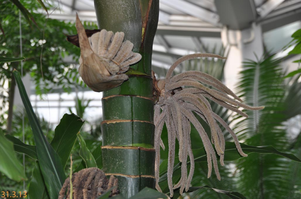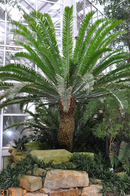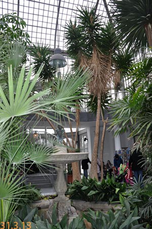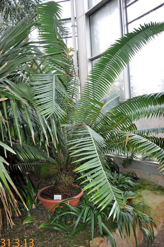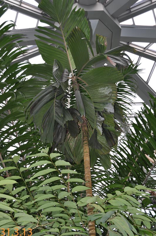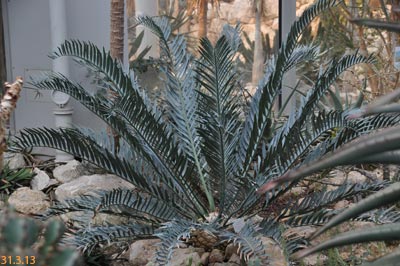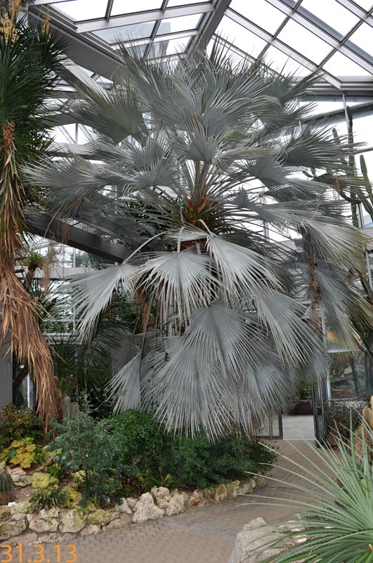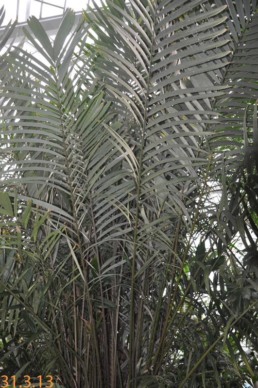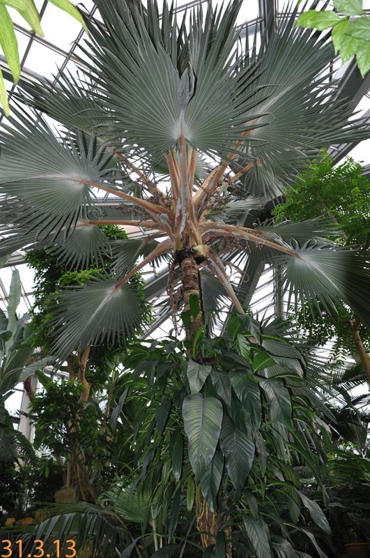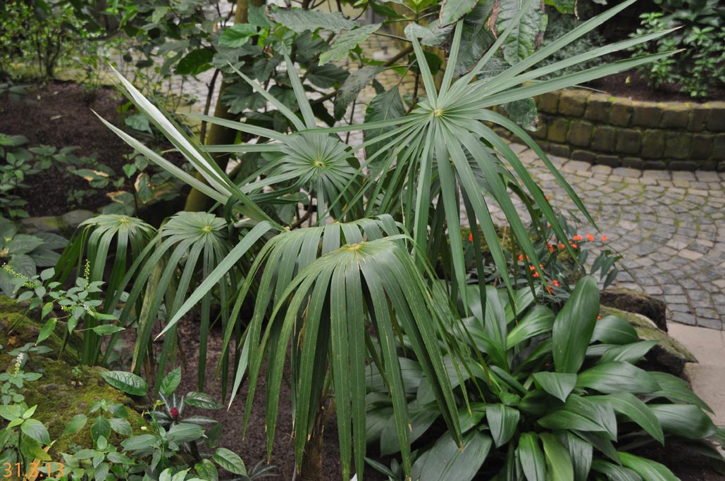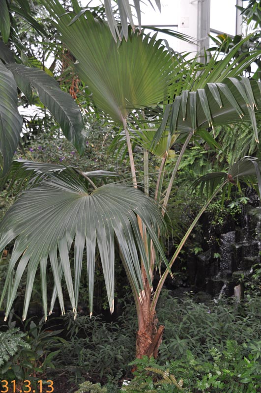 Besuch im Palmengarten FrankfurtLeider hatten wir nur knapp zwei Stunden Zeit für unseren kleinen Abstecher zum Palmengarten in Frankfurt, aber es hat sich dennoch gelohnt, denn dieser Palmengarten ist allemale einen Besuch wert. Da wir nur wenig Zeit hatten, mussten wir natürlich einen "Schnelldurchlauf" machen, aber dennoch bekamen wir viel Interessantes zu sehen und vor allem Appetit, so dass wir sicher noch einmal mit etwas mehr Zeit wiederkommen werden. Bei düsterem kalten und windigem Wetter kamen wir nachmittags in Frankfurt an. Die Trachies auf der Wiese vor dem Eingang machten einen recht mitgenommenen Eindruck, obwohl der Winter ja nicht sonderlich kalt war. Jedenfalls hatten die Trachies nur sehr spärliche Kronen. Die Vorgeschichte dieser Trachies kenne ich leider nicht. So, nun aber einige Bilder aus den verschiedenen Palmenhäusern... Xeronema callistemon Zwischen den Palmen gab es natürlich auch unzählige andere Pflanzen wie u.a. auch Palmfarne, Baumfarne etc.. Insbesondere die Palmfarne haben es mir sehr angetan. Schon lange spiele ich mit dem Gedanken mir einige Palmfarne zu besorgen um auch die mal ausgepflanzt im Garten zu probieren. Leider gibt es nur se wenige Erfahrungen in diesem Bereich, obwohl es einige Gattungen und Arten gibt, die durchaus mal einen Versuch wert wären. Leider sind größere Palmfarne recht schwierig zu bekommen und auch recht teuer. Jungpflanzen wachsen meist recht langsam. Besonders die "Brotpalmfarne" Encephalartos haben es mir schon lange angetan... Encephalartos lebomboensis Cycas thouarsii Trithrinax acanthocoma S. palmetto Ein Hingucke den ich bisher nur von Bildern kannte. Die Doum-Palme Hyphaene thebaica Sehr grüne Bismarckia nobilis. Bin mir nicht sicher ob es die grüne Form ist, oder ob die grünen Blätter mit der Gewächshaushaltung zu tun haben. Die Petiolen waren interessanter Weise silberblau. Beeindruckende Goldfruchtpalmen (Dypsis lutescens), die noch als Chrysalidocarpus lutescens beschriftet sind. Ein äußerst stacheliger Geselle, den ich bisher nicht kannte. Die Sternusspalme Astrocaryum mexicanum Sehr schöne Burretiokentia hapala Pelagodoxa henryana Sehr schöne Latania loddigesii. Eine Jungpflanze, an der man noch die roten Ränder an Blättern und Petiolen erkennt und daneben eine adulte Pflanze die deutlich macht warum diese Palme "Blaue Latanpalme" heißt. Eine wunderschöne Palme! Pritchardia lanigera Salacca zalacca Elaeis guineensis - Afrik.Ölpalme Prestoea acuminata Kentiopsis olivaeformis Sieht aus wie eine Palme, ist aber keine: Carludovica palmata, die "Panamahutpalme" aus der Familie der Scheibenblumengewächse (Cyclanthaceae) So, natürlich gab es noch einiges mehr zu sehen, allerdings reichte dafür unsere Zeit nicht aus. Aber eines ist klar - ich werde sicher nochmal wiederkommen und mehr Zeit mitbringen...