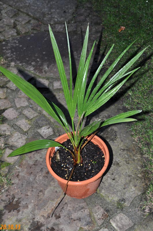 PFLANZENMARKTWenn man dieses Hobby recht intensiv betreibt, sammeln sich im Laufe der Jahre doch so einige Pflänzchen an. Gerne probiert man mal das ein oder andere Pflänzchen nachzuziehen, es keimen mehr Samen als gedacht, man sammelt hier, man sammelt dort....und irgendwann weiß man nicht mehr wohin mit den vielen Pflänzchen. Da ich nicht vorhabe einen Pflanzenhandel zu betreiben, andererseits aber auch nicht mehr einfach alles kostenlos abgeben möchte (habe da leider bisher recht schlechte Erfahrungen gemacht), habe ich mir nun überlegt hier eine Seite einzurichten, auf der ich meine überschüssigen Pflänzchen anbiete. Am liebsten wäre es mir, wenn Interessenten etwas zum Tausch anbieten könnten. Haben Sie nichts zu tauschen, können die angebotenen Pflanzen natürlich auch gekauft werden. Allerdings mag ich hier keine Festpreise angeben, sondern die Preise sind frei verhandelbar. Machen Sie einfach ein Angebot und ich antworte ob der Preis okay ist oder eben nicht. Ich will hier keine Gewinne erwirtschaften, aber ich würde mich halt freuen zumindest meine Kosten etwas reduzieren zu können. Bin mal gespannt, ob das funktioniert... Also, bei Interesse oder Fragen einfach eine Mail schicken:MAIL AN MICHZur Zeit habe ich folgende Pflanzen übrig: Musella lasiocarpa 22.10.13 Es handelt sich um Ableger meiner Mutterpflanze. Alle Pflanzen wurden je nach Größe bereits mindestens ein Jahr bewurzelt. Sie stehen bei mir im Sommer (teils in Pötten, teils ausgepflanzt) draußen im Freien bis zum ersten Frost, danach werden sie kühl (bei 2-10°C) hell überwintert. Möglich ist bei dieser Zierbanane aber auch eine warme Überwinterung, dann benötigt sie aber sehr viel Licht und möchte ab und zu eingenebelt werden. Ich habe zur Zeit Pflanzen von etwa 60-180cm Größe Ensete ventricosum "Maurelii" 22.10.13 Es handelt sich um Ableger meiner größeren Maureliis. Die kleineren Maureliis wurden erst dieses Jahr von der Mutterpflanze getrennt und haben dementsprechend noch relativ wenige eigene Wurzeln.Dies ist aber kein Problem, da Maureliis im Frühjahr nach der Überwinterung stets innerhalb weniger Wochen neue Wurzeln bilden. Die kleineren Maureliis stehen während des Sommers in Töpfen draußen im Freien, die größeren Maureliis waren ausgepflanzt und wurden heute ausgegraben und eingetopft. Ich überwintere meine Maureliis hell und mit Substrat im Topf. Ganz junge Maurelliis überwintere ich warm, sehr große Maureliis die nicht mehr in Töpfe passen überwintere ich auch ohne Substrat kalt. Abgeben kann ich Maureliis in verschiedenen Größen bis ca. 150cm Pflanzenhöhe. Caesalpinia gilliesii 22.10.13 Diese Caesalpinias habe ich aus Samen meiner größeren ausgepflanzten C. gilliesii gezogen. Ich habe einjährige und zweijährige Pflanzen. Die Jungpflanzen stehen ganzjährig draußen im Freien. Im ersten Winter überwintere ich sie noch bei 2-10°C kühl, bereits im zweiten Jahr bleiben sie draußen im Winterschutz einer meiner Palmen und werden dann ab etwa -4°C beheizt. Trachycarpus fortunei 22.10.13 Hier handelt es sich um Trachies die bereits eine Vorselektion erfahren haben. Alle Trachies sind im Garten frei gekeimt und haben sich dort ein bis zwei Jahre alleine entwickelt und mussten auch die Winter ohne Hilfe überstehen. Erst danach habe ich sie ausgegraben und in Töpfe gesetzt. Nun stehen sie in Töpfen ganzjährig draußen, werden nur wenn es sehr kalt werden soll (ab zweistelligen Minusgraden oder bei längerem Dauerfrost) kurzzeitig in einem beheizten Palmenschutz untergestellt. Durch diese Behandlung kann man zumindest sicher sein, dass es sich um robuste Pflanzen handelt, da sie bereits einiges mitmachen mussten. Chamaerops humilis 22.10.13 Aus Samen gezogen und dann in Töpfen gehalten. Die Palmen stehen ganzjährig draußen. Bei tieferem Frost oder Dauerfrost überwintern sie in einem meiner Palmenwinterschutzhäusern. Trachycarpus princeps 22.10.13 Die Princeps stehen ganzjährig draußen und werden bei tieferen Frösten oder bei Dauerfrost in einem Pamenwinterschutzhaus untergebracht (-4°C)