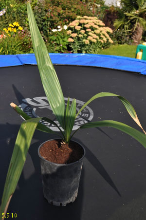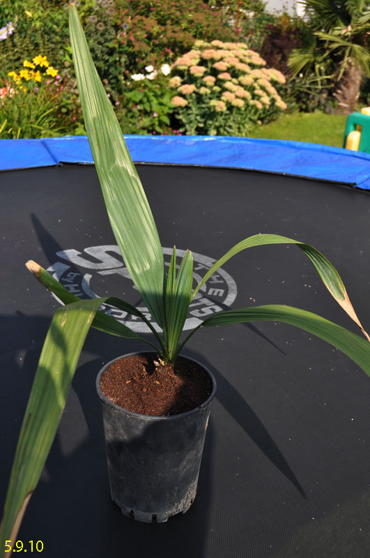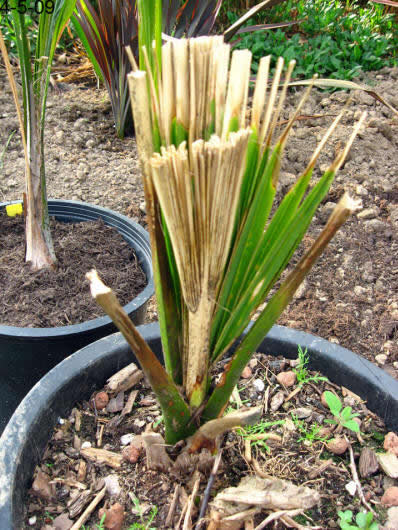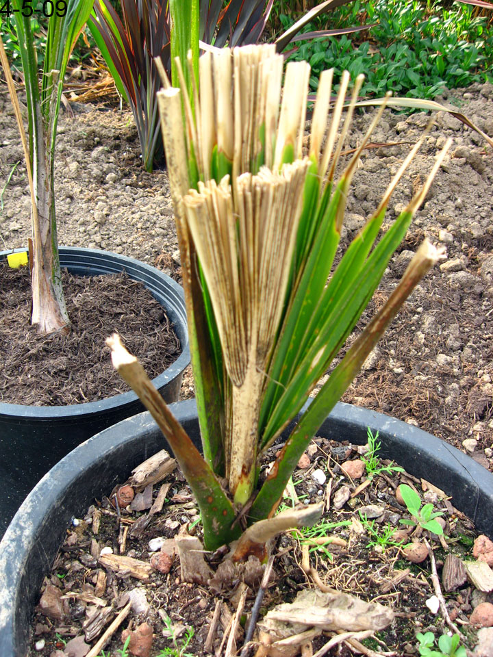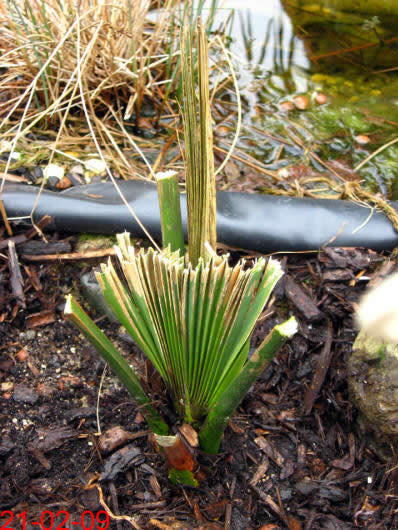 Sabal minor var. louisianaDiese Variation hat etwas bläulichere Blätter als die Sabal minor. Dieses Exemplar habe ich 2009 am Standort der der schwer geschädigten S. minor bzw. etonia gepflanzt. 2010Während des Winters wurde diese Sabal lediglich in kalten Nächten mit Vlies abgedeckt. Später sind alle Blattteile die aus dem Mulch herausschauten vertrocknet. Mal sehen wie lange sie zur Regeneration benötigt. Immerhin, im Juni schiebt sie bereits ein neues Blättchen...