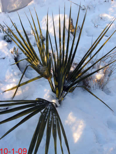 Sabal minorDiese im gesamten Südosten der USA vorkommende Palme bildet in der Regel nur einen unterirdischen Stamm und wächst eher buschartig. Dabei besteht die Blattkrone meist nur aus einigen wenigen bläulich-grünen Blättern. Auffällig sind die völlig glatten Blattstiele. Es gibt sehr viele verschiedene Sabalarten und innerhalb der Arten meist mehrere Variationen, so dass es sehr schwierig ist Sabal minor, die für unser Klima am besten geeignet scheint, eindeutig zu identifizieren. So werden oftmals Sabal minors in Pflanzencentern angeboten, bei denen sich erst später (meist, wenn sie bei an sich harmlosen Temperaturen erfroren ist) herausstellt, dass es in Wirklichkeit keine „Minor“ war. Unterscheidungsmerkmale sind das costapalmate Blatt, bei dem nur das mittlere Blattsegment bis zur Basis eingeschnitten ist, sowie der die Blatthöhe überragende Blütenstand. Im Gegensatz zu einigen anderen Arten dürfen keine Fäden zwischen den Blattsegmenten vorhanden sein. In ihrer Heimat wächst sie auf feuchten, humosen Böden meist als Unterbewuchs unter Bäumen in einem im Sommer feucht-heißen, im Winter kühlen und trockenerem Klima auf. Derartige Bedingungen kann man der Pflanze in unserem Klima kaum bieten und daraus ergibt sich der Nachteil dieser Palme, dass sie bei uns nur sehr langsam wächst, wodurch ihr Regenerationsvermögen natürlich auch sehr eingeschränkt ist. Nach Schäden erholt sich die Pflanze wenn überhaupt erst nach Jahren. Echte Sabal minors sollen am Blatt kurzfristig bis zu -20°C überstehen können, allerdings reagiert sie empfindlich auf Dauerfrost, was darauf schließen läßt, dass die Wurzeln, sowie das unter der Erde liegende Herz der Palme recht frostempfindlich sind. Kurze Fröste muss sie auch in ihrer Heimat ab und zu überstehen – gefrorene Böden kennt sie von dort aber nicht. Diese Sabal hatte ich als Sabal minor gekauft. Sicher war ich mir von Anfang an nicht, ob es sich tatsächlich um eine Minor handelte. Der Beschreibung auf dieser sehr interessanten Website http://www.efloras.org/florataxon.aspx?flora_id=1&taxon_id=128944 nach zu urteilen, denke ich eher, dass es sich um eine Sabal etonia handeln könnte, da sie Fäden zwischen den Blattsegmenten hatte, was bei einer Minor eigentlich nicht vorkommen dürfte. Jedenfalls sind die Blätter bis zum Boden auf Höhe der schützenden Schneeschicht zurückgefroren. Ob die Palme überlebt wird sich wohl erst noch zeigen. Da Sabals hier in unserem Klima sehr sehr langsam wachsen, dürfte eine Regeneration sehr schwierig und langwierig werden. wieder in Freiheit entlassen...