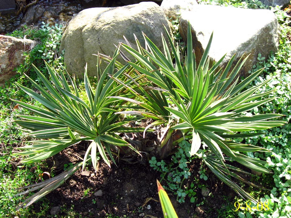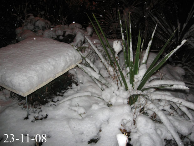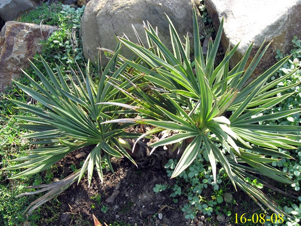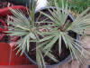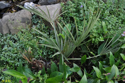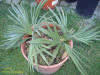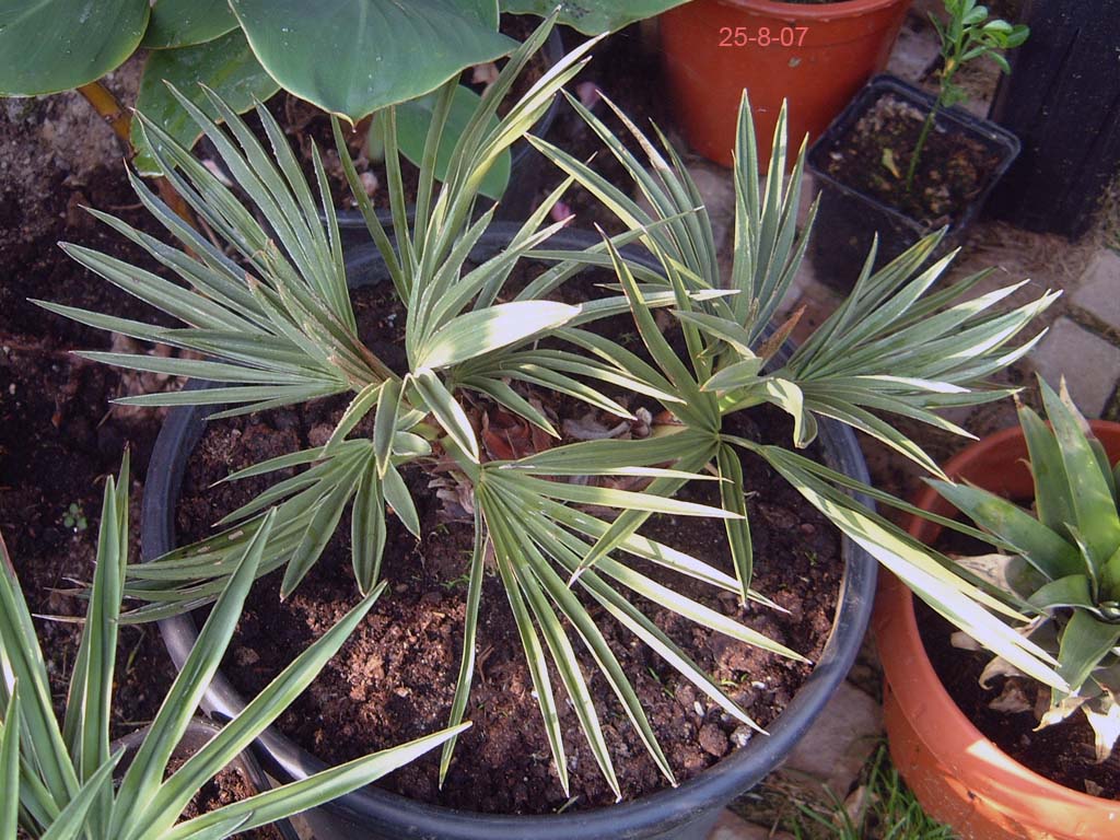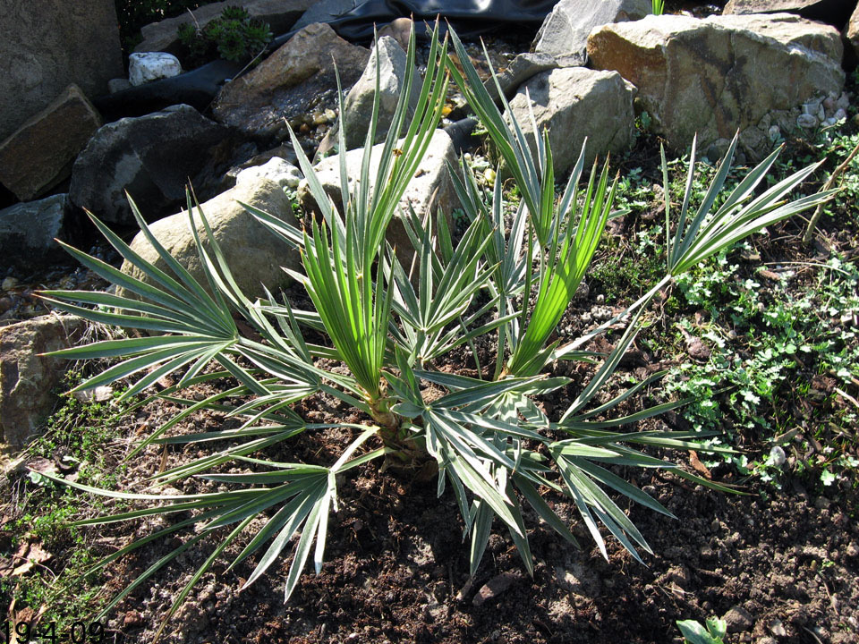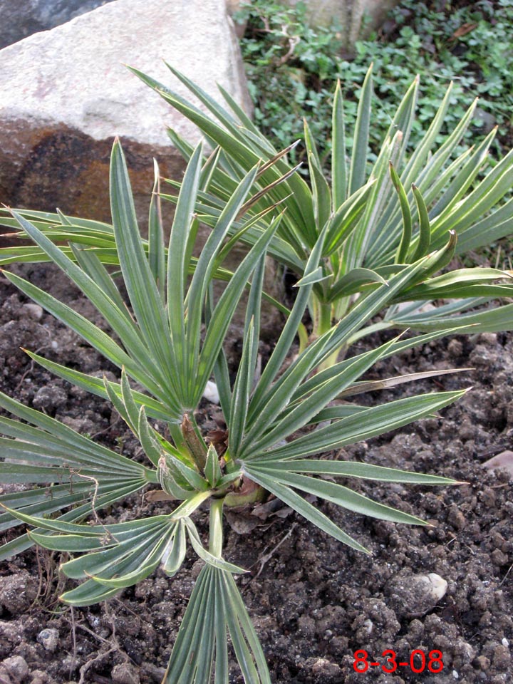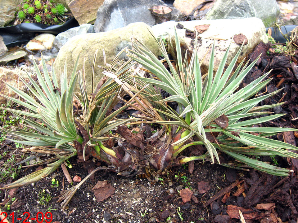 TrithrinaxTrithrinax campestris Diese bis 8m groß werdende Palme stammt aus Argentinien und Uruguay, wo sie häufig in Dornwäldern, oder kargem, sandigem Weideland vorkommt. Wichtig auch für die Haltung bei uns erscheint mir, dass es dort im Winter sehr trocken ist, während es im Sommer oft sogar zu Überflutungen kommen kann, woraus sich auch die Nässeempfindlichkeit im Winter ergibt.Wie weiter unten geschildert, hat ihr bei mir im Garten allerdings auch der aufgebaute Nässeschutz nichts gebracht. Bei Temperaturen von -16,5°C ist sie trotz Mulchung erfroren. Angegeben wird die Frosttoleranz dieser Palme mit etwa -12 bis -15°C, ich denke allerdings, dass derartige Temperaturen nur von älteren Exemplaren überstanden werden können. Leider hat meine kleine T.campestris den Winter 2009 nicht überstanden. Nach und nach färbten sich sämtliche Blätter und auch die Neutriebe braun. Heute konnte ich bei beiden Trinis die Speerchen ziehen. Da Trithrinax nicht gerade zu den schnellwüchsigsten Palmen zählt werde ich die Pflanze wohl ausgraben und in einen Topf setzen. Mal sehen ob sie sich noch zurückmeldet.... Nein, hat sie nicht! Exitus! 2009