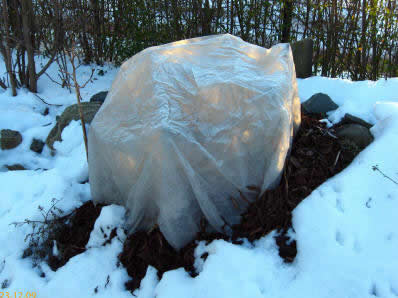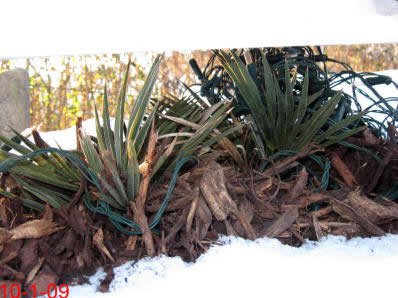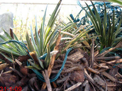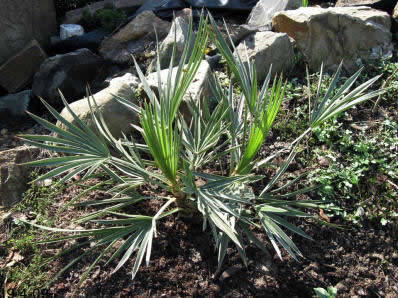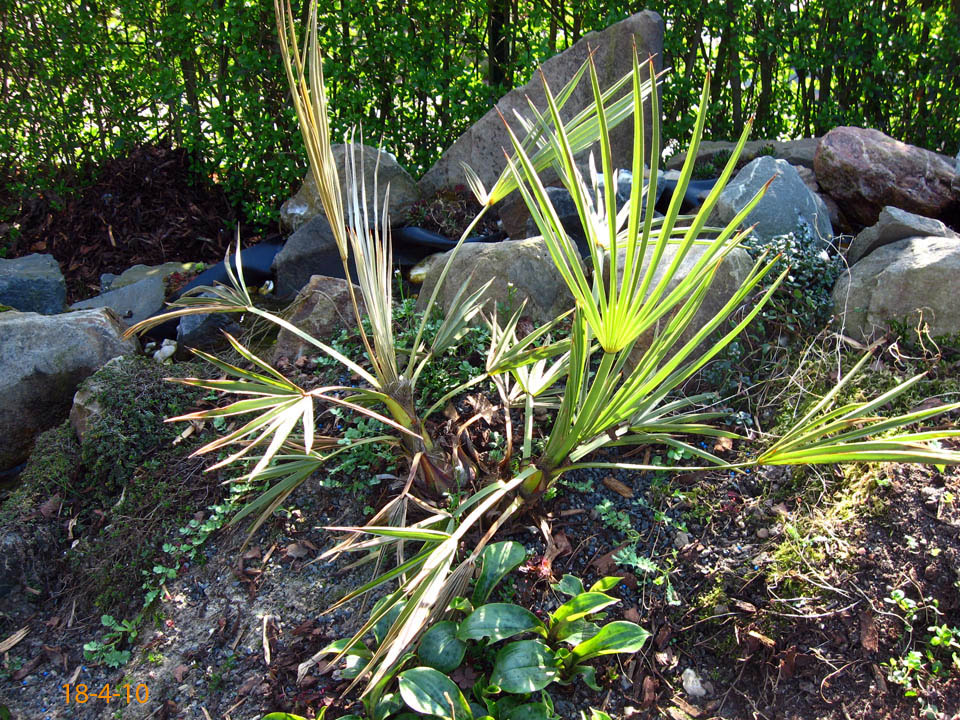 Habe heute eine neue T. campestris erworben und werde sie in den nächsten Tagen auspflanzen... Winterschutz 09/10: Gut gemulcht und per Vlies eingepackt. Im Mulch verläuft eine Windung eines ab -6°C geschalteten Lichterschlauchs, der am UT-100 des Butiawinterschutzes angeschlossen ist. Der Lichterschlauch ist deshalb nur ab und zu für wenige Minuten in Betrieb. Den Winter schien die Trithrinax zunächst gut überstanden zu haben, obwohl sie nur an den kalten Tagen per Vlies geschützt war und ansonsten frei stand - also auch ohne Nässeschutz. Später zeigten sich dann aber doch Schäden. Im April vertrockneten die Blätter der linken Seite. Den Sommer über tat sich so gut wie nichts. Erst im September zeigte die Trithrinax wieder etwas Leben. Selbst die linke Hälfte scheint noch zu leben, denn zaghaft erscheint ein neuer Speer. Nachdem die Trithrinax auch im folgenden Winter wieder Probleme hatte und alle Blätter verlor, habe ich sie erstmal wieder eingetopft und werde vorläufig zumindest mit kleineren Exemplaren auf weitere Auspflanzungen verzichten.