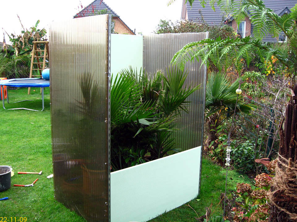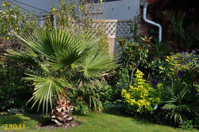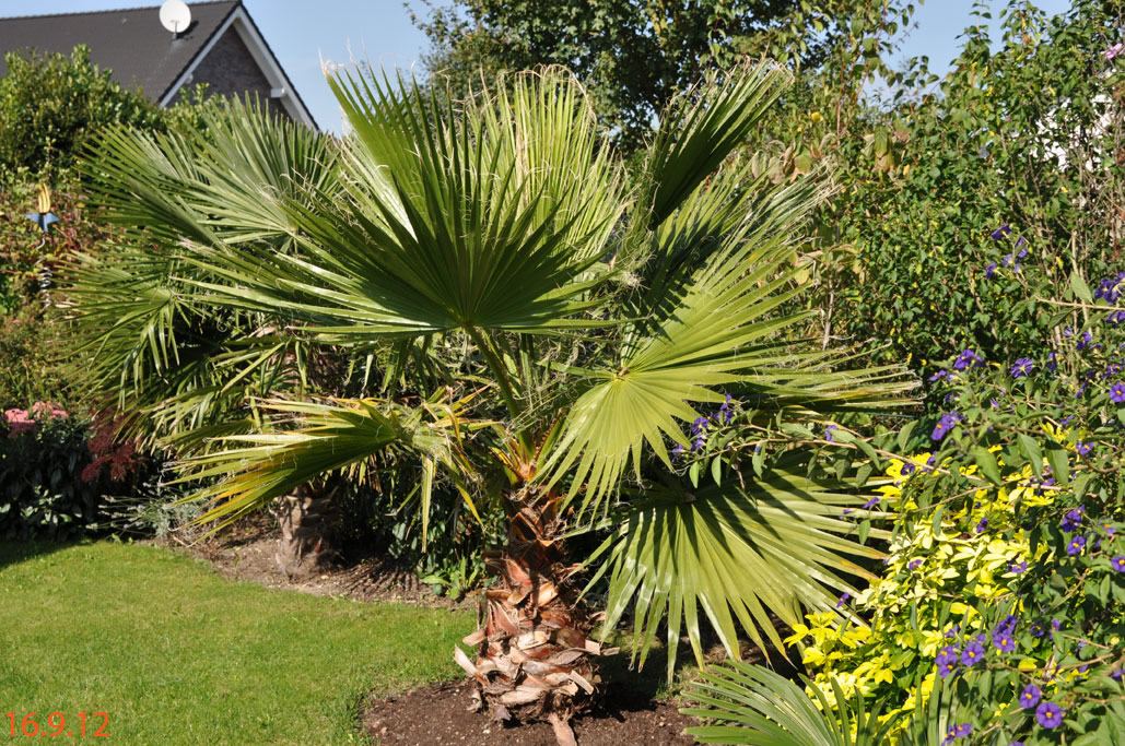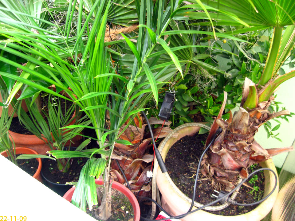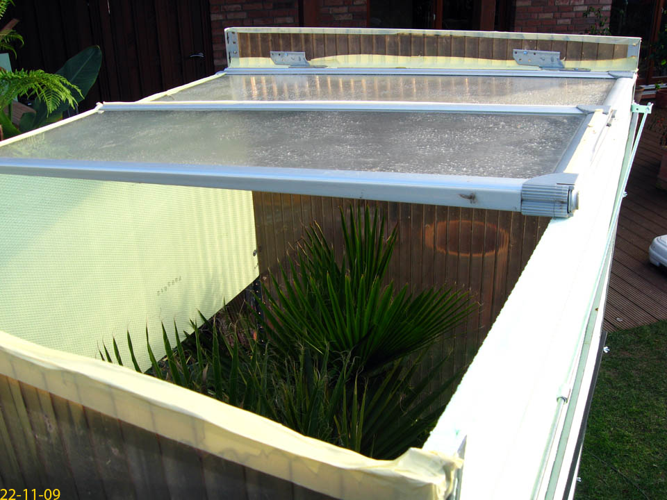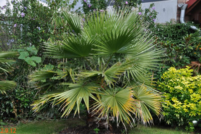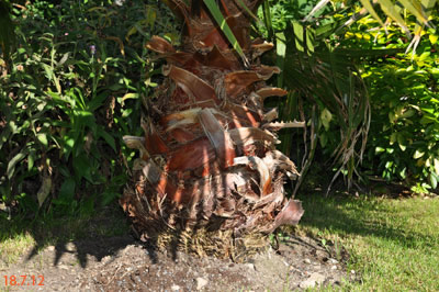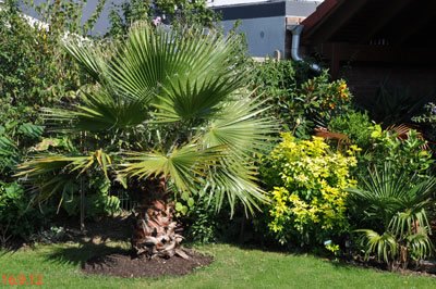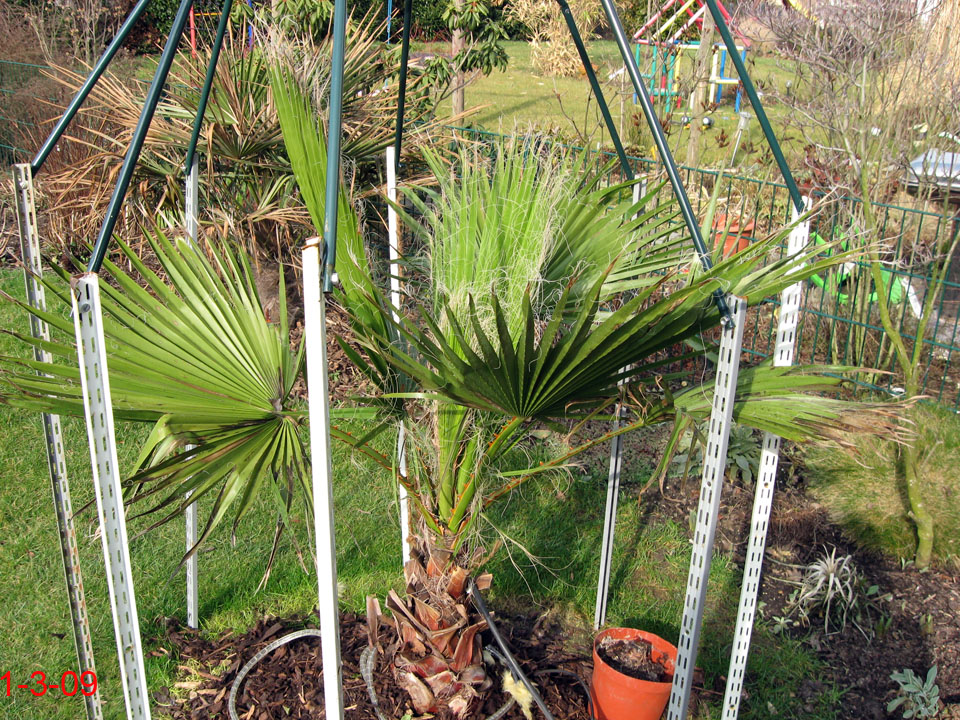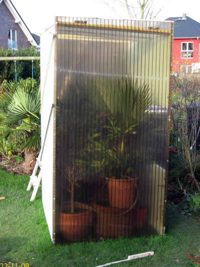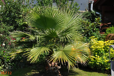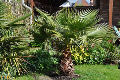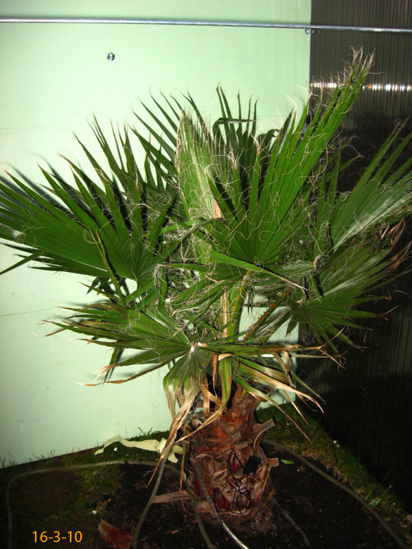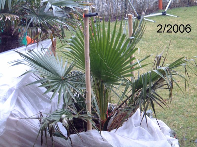 2005/20062007Diese Robusta pflanzte ich im Frühjahr 2007. Bereits in ihrer ersten Wachstumssaison beeindruckte sie mit erstaunlichem Wachstum und brachte es bis zum Herbst auf fast 20 Blätter Zuwachs. Als Winterschutz baute ich ein Gestell, ähnlich der Rosenbogenmethode. Um die Washi besonders gut zu schützen und um Heizkosten zu sparen baute ich einen Schutz im Schutz. Die Außenfolie bestand aus weißer Gewebeplane, innen umbaute ich die zusammengeschnürte Palme zusätzlich mit einem Vlies. Ich dachte, ich könnte so einen Kontakt der Blätter zur Außenfolie auf jeden Fall vermeiden. Leider funktionierte dieser Schutz nicht, obwohl ich bereits ab -3°C die Palme per Heizlüfter beheizte. Problematisch war, dass mir bereits beim Zusammenbinden der Fächer zwei Blätter abgebrochen sind - Washingtoniablätter sind ziemlich starr und brechen leicht, wenn man sie zu sehr zusammendrückt. Dazu kam, dass der doppelte Schutz scheinbar zu luftdicht war. Nachdem sie den Winter zunächst ganz gut überstanden zu haben schien, verschimmelte dann im Frühjahr plötzlich der zentrale Speer, so dass ich die Blätter abschneiden musste. Zum Glück blieb der Speer aber fest und so wuchs der vom Schimmel befallende Speer aus dem Stamm heraus. Zusätzlich zeigten sich an den neuesten Blättern leichte Schäden durch Nährstoffmangel, welche ich auf zu kalte Bodentemperaturen zurückführe. 2008Dennoch erholte sich die Palme bei zunehmender Wärme dank ihres ausgezeichneten Regenerationsvermögens hervorragend. Bereits im Sommer sah die Washingtonia schon wieder sehr gut aus und legte besonders am Stamm ordentlich zu. Mir wurde klar, dass sie zu nah am daneben liegenden Teich gepflanzt war, so dass ein größerer luftiger Winterschutz an dieser Stelle nicht machbar sein würde. Ich entschloss mich deshalb, die Palme noch in diesem Sommer umzupflanzen. Bei dieser nicht ganz leichten Ausbuddelaktion wurden leider eine Menge Wurzeln verletzt, zusätzlich war es zu dieser Zeit sehr warm, so dass am neuen Standort nach und nach die Blätter vertrockneten. Es dauerte fast zwei Monate, bis sich die Washi von dieser Umpflanzung erholte und langsam wieder Wachstum zeigte. Aber zumindest hatte ich nun Platz für einen ausreichend dimensionierten Winterschutz, so dass ich die Blätter nicht zu eng binden brauchte. 2009Der Winter 2008/2009 hatte es in sich mit Tiefstwerten von -16,5°C (2m geschützt gemessen. Dennoch machte die Washi an ihrem neuen Standort mit dem verbesserten Winterschutz einen guten Eindruck. Der Winterschutz bestand aus einer Umbauung aus Gewebeplane, zusätzlich wurde der untere Bereich zusätzlich mit Steinwolle isoliert. Um eine ausreichende Belüftung zu gewährleisten wurde der Schutz stets bei positiven Außentemperaturen geöffnet, dazu war permanent ein auf den zentralen Speer gerichteter PC-Lüfter im Einsatz. Beheizt wurde mit einem Lichtschlauch der sich thermostatgesteuert bei -1,5°C einschaltete. Falls der Lichtschlauch nicht ausgereicht hätte, hätte sich ein sicherheitshalber zusätzlich installierter 400 W Frostwächter im Schutz bei -3°C eingeschaltet . Jedenfalls hatte die Palme im Frühjahr keine sichtbaren Schäden. Allerdings wollte sie zunächst nicht recht wachsen, so dass ich annehme, dass sie doch durch die lange anhaltenden tiefen Bodentemperaturen einen leichten Wurzelschaden abbekommen hatte. Statt neue Blätter zu schieben verlor sie zunächst zwei ältere Blätter die langsam vertrockneten, bis sie dann im Juli plötzlich startete. Von Juli bis zum Ende der Wachstumssaison im Oktober hat sich die Washi dann noch prima entwickelt. Mein Winterschutz 09/10Die Washi steht dieses Jahr in einer Kombination aus Styrodurplatten und alten Doppelstegplatten einer ehem. Terrassenüberdachung. Das Gerüst besteht aus Alugestängen, die etwa 25 cm tief im Boden stecken. Den ersten Sturm hat die Konstruktion heute bereits bestens gemeistert, so dass eine Abspannung überflüssig sein dürfte. Das beste an diesem Schutz ist aber, dass ich eine alte Duschwand auftreiben konnte, die ich als Dach zurecht gesägt habe, so dass ich das Dach nun je nach Bedarf einfach teilweise oder auch komplett öffnen kann. Eine Styrodurplatte an der Seite kann ebenfalls einfach aufgeklappt werden, so dass ich zum Gießen etc. überall gut rankomme. Zur Beheizung habe ich zunächst mal einen Lichtschlauch am Boden verlegt, der einerseits den Boden frostfrei halten soll, andererseits die mit im Schutz untergebrachten Töpfe vor dem Durchfrieren schützt. Zusätzlich steht eine 100W Lampe im Schutz. Mal sehen wie weit ich mit dieser Beheizung komme, denn beheizen will ich die Washi wieder ab -1,5°C. Sollte ich diese Temperatur nicht halten können, installiere ich zusätzlich einen Frostwächter. Ein Ventilator im Inneren sorgt permanent für Luftbewegung, auch wenn der Schutz verschlossen ist. Nach dem ersten Wintereinbruch im Dez. 09 zeigt sich, dass der Schutz sehr effektiv funktioniert. Bei -12,7°C reicht ein Lichtschlauch völlig aus um die Temperatur im Schutz zu halten. 2010Zum ersten Mal scheint es gelungen zu sein die Washi ohne Schaden durch den Winter zu bekommen, obwohl gerade dieser Winter sehr lang war. Zudem hat sich der neue Winterschutz als sehr effektiv erwiesen. Dank Styrodur und Doppelstegplatten reichten ein Lichterschlauch und eine 100W Glühlampe völlig aus den Schutz auf -1,5°C zu halten. Selbst bei tiefen Temperaturen leuchteten die Lämpchen nur für kurze Zeit, so dass nur wenig Strom verbraucht wurde. Wie sich inzwischen herausstellt, hat die Überwinterung auch dieses Jahr wieder nicht reibungslos funktioniert. Nachdem die Palme anfangs noch kerngesund aussah, baute sie ab April stark ab. Die Speere vertrockneten und auch die Blätter begannen braun zu werden. Woran es nun gelegen hat ist die Frage? Ein einziges Mal kam es zu einem Heizungsausfall, als Kinder den Schalter der Stromversorgung versehentlich ausschalteten. Bis ich das bemerkte waren es innerhalb 