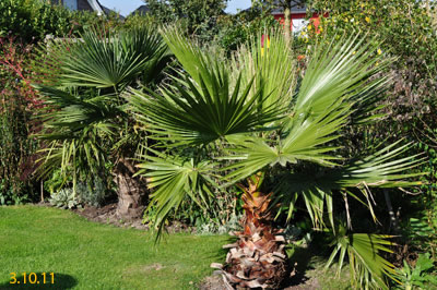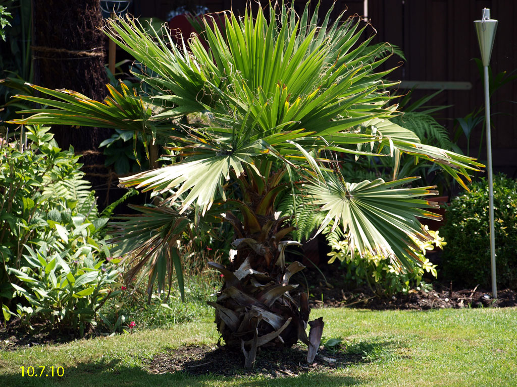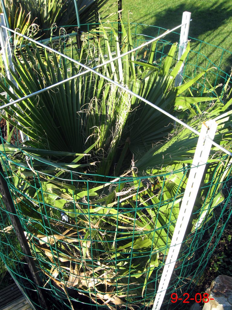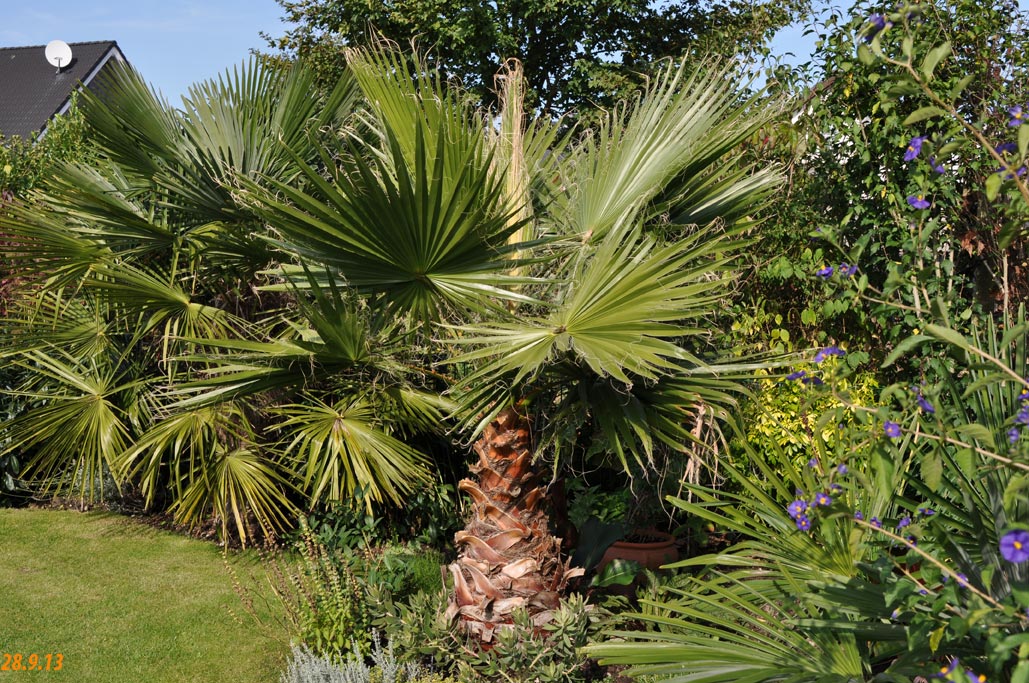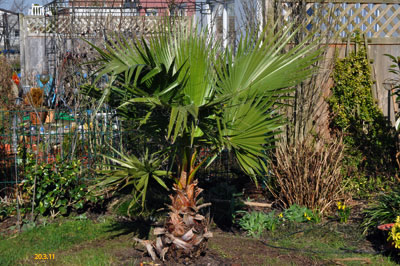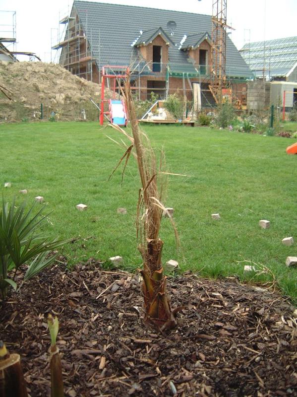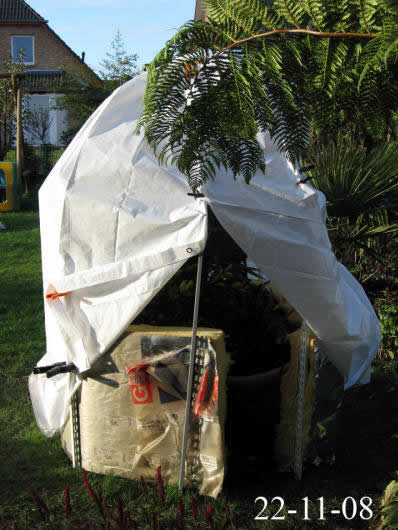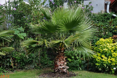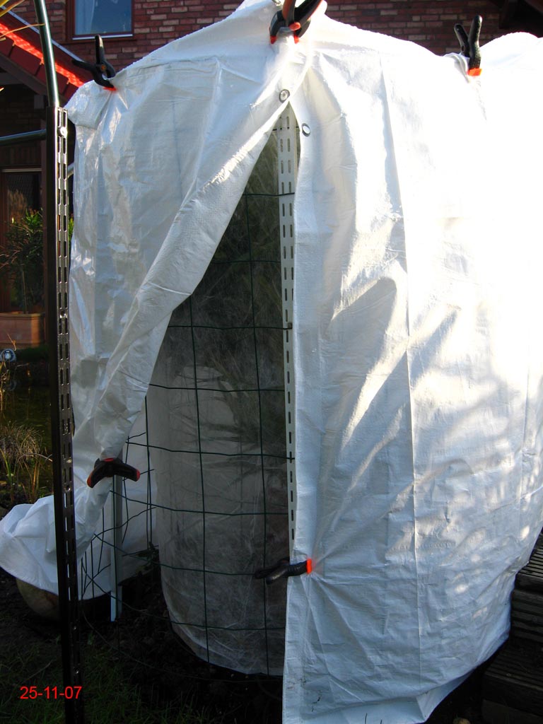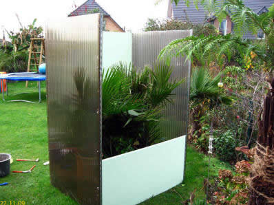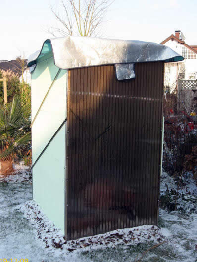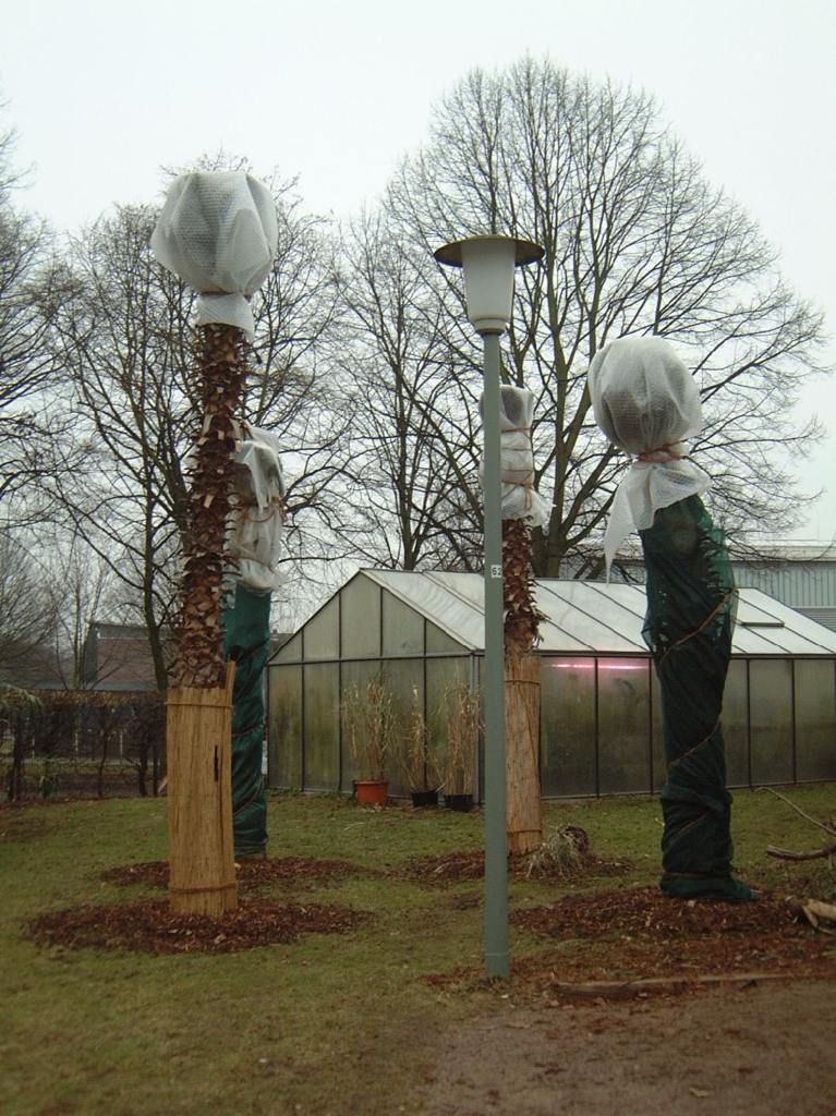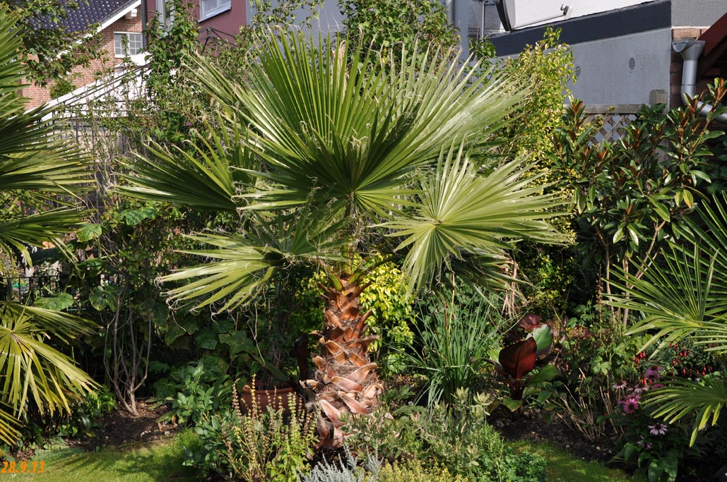 2005/20062007Diese Robusta pflanzte ich im Frühjahr 2007. Bereits in ihrer ersten Wachstumssaison beeindruckte sie mit erstaunlichem Wachstum und brachte es bis zum Herbst auf fast 20 Blätter Zuwachs. Als Winterschutz baute ich ein Gestell, ähnlich der Rosenbogenmethode. Um die Washi besonders gut zu schützen und um Heizkosten zu sparen baute ich einen Schutz im Schutz. Die Außenfolie bestand aus weißer Gewebeplane, innen umbaute ich die zusammengeschnürte Palme zusätzlich mit einem Vlies. Ich dachte, ich könnte so einen Kontakt der Blätter zur Außenfolie auf jeden Fall vermeiden. Leider funktionierte dieser Schutz nicht, obwohl ich bereits ab -3°C die Palme per Heizlüfter beheizte. Problematisch war, dass mir bereits beim Zusammenbinden der Fächer zwei Blätter abgebrochen sind - Washingtoniablätter sind ziemlich starr und brechen leicht, wenn man sie zu sehr zusammendrückt. Dazu kam, dass der doppelte Schutz scheinbar zu luftdicht war. Nachdem sie den Winter zunächst ganz gut überstanden zu haben schien, verschimmelte dann im Frühjahr plötzlich der zentrale Speer, so dass ich die Blätter abschneiden musste. Zum Glück blieb der Speer aber fest und so wuchs der vom Schimmel befallende Speer aus dem Stamm heraus. Zusätzlich zeigten sich an den neuesten Blättern leichte Schäden durch Nährstoffmangel, welche ich auf zu kalte Bodentemperaturen zurückführe. 2008Dennoch erholte sich die Palme bei zunehmender Wärme dank ihres ausgezeichneten Regenerationsvermögens hervorragend. Bereits im Sommer sah die Washingtonia schon wieder sehr gut aus und legte besonders am Stamm ordentlich zu. Mir wurde klar, dass sie zu nah am daneben liegenden Teich gepflanzt war, so dass ein größerer luftiger Winterschutz an dieser Stelle nicht machbar sein würde. Ich entschloss mich deshalb, die Palme noch in diesem Sommer umzupflanzen. Bei dieser nicht ganz leichten Ausbuddelaktion wurden leider eine Menge Wurzeln verletzt, zusätzlich war es zu dieser Zeit sehr warm, so dass am neuen Standort nach und nach die Blätter vertrockneten. Es dauerte fast zwei Monate, bis sich die Washi von dieser Umpflanzung erholte und langsam wieder Wachstum zeigte. Aber zumindest hatte ich nun Platz für einen ausreichend dimensionierten Winterschutz, so dass ich die Blätter nicht zu eng binden brauchte. 2009Der Winter 2008/2009 hatte es in sich mit Tiefstwerten von -16,5°C (2m geschützt gemessen. Dennoch machte die Washi an ihrem neuen Standort mit dem verbesserten Winterschutz einen guten Eindruck. Der Winterschutz bestand aus einer Umbauung aus Gewebeplane, zusätzlich wurde der untere Bereich zusätzlich mit Steinwolle isoliert. Um eine ausreichende Belüftung zu gewährleisten wurde der Schutz stets bei positiven Außentemperaturen geöffnet, dazu war permanent ein auf den zentralen Speer gerichteter PC-Lüfter im Einsatz. Beheizt wurde mit einem Lichtschlauch der sich thermostatgesteuert bei -1,5°C einschaltete. Falls der Lichtschlauch nicht ausgereicht hätte, hätte sich ein sicherheitshalber zusätzlich installierter 400 W Frostwächter im Schutz bei -3°C eingeschaltet . Jedenfalls hatte die Palme im Frühjahr keine sichtbaren Schäden. Allerdings wollte sie zunächst nicht recht wachsen, so dass ich annehme, dass sie doch durch die lange anhaltenden tiefen Bodentemperaturen einen leichten Wurzelschaden abbekommen hatte. Statt neue Blätter zu schieben verlor sie zunächst zwei ältere Blätter die langsam vertrockneten, bis sie dann im Juli plötzlich startete. Von Juli bis zum Ende der Wachstumssaison im Oktober hat sich die Washi dann noch prima entwickelt. Mein Winterschutz 09/10Die Washi steht dieses Jahr in einer Kombination aus Styrodurplatten und alten Doppelstegplatten einer ehem. Terrassenüberdachung. Das Gerüst besteht aus Alugestängen, die etwa 25 cm tief im Boden stecken. Den ersten Sturm hat die Konstruktion heute bereits bestens gemeistert, so dass eine Abspannung überflüssig sein dürfte. Das beste an diesem Schutz ist aber, dass ich eine alte Duschwand auftreiben konnte, die ich als Dach zurecht gesägt habe, so dass ich das Dach nun je nach Bedarf einfach teilweise oder auch komplett öffnen kann. Eine Styrodurplatte an der Seite kann ebenfalls einfach aufgeklappt werden, so dass ich zum Gießen etc. überall gut rankomme. Zur Beheizung habe ich zunächst mal einen Lichtschlauch am Boden verlegt, der einerseits den Boden frostfrei halten soll, andererseits die mit im Schutz untergebrachten Töpfe vor dem Durchfrieren schützt. Zusätzlich steht eine 100W Lampe im Schutz. Mal sehen wie weit ich mit dieser Beheizung komme, denn beheizen will ich die Washi wieder ab -1,5°C. Sollte ich diese Temperatur nicht halten können, installiere ich zusätzlich einen Frostwächter. Ein Ventilator im Inneren sorgt permanent für Luftbewegung, auch wenn der Schutz verschlossen ist. Nach dem ersten Wintereinbruch im Dez. 09 zeigt sich, dass der Schutz sehr effektiv funktioniert. Bei -12,7°C reicht ein Lichtschlauch völlig aus um die Temperatur im Schutz zu halten. 2010Zum ersten Mal scheint es gelungen zu sein die Washi ohne Schaden durch den Winter zu bekommen, obwohl gerade dieser Winter sehr lang war. Zudem hat sich der neue Winterschutz als sehr effektiv erwiesen. Dank Styrodur und Doppelstegplatten reichten ein Lichterschlauch und eine 100W Glühlampe völlig aus den Schutz auf -1,5°C zu halten. Selbst bei tiefen Temperaturen leuchteten die Lämpchen nur für kurze Zeit, so dass nur wenig Strom verbraucht wurde. Wie sich inzwischen herausstellt, hat die Überwinterung auch dieses Jahr wieder nicht reibungslos funktioniert. Nachdem die Palme anfangs noch kerngesund aussah, baute sie ab April stark ab. Die Speere vertrockneten und auch die Blätter begannen braun zu werden. Woran es nun gelegen hat ist die Frage? Ein einziges Mal kam es zu einem Heizungsausfall, als Kinder den Schalter der Stromversorgung versehentlich ausschalteten. Bis ich das bemerkte waren es innerhalb 