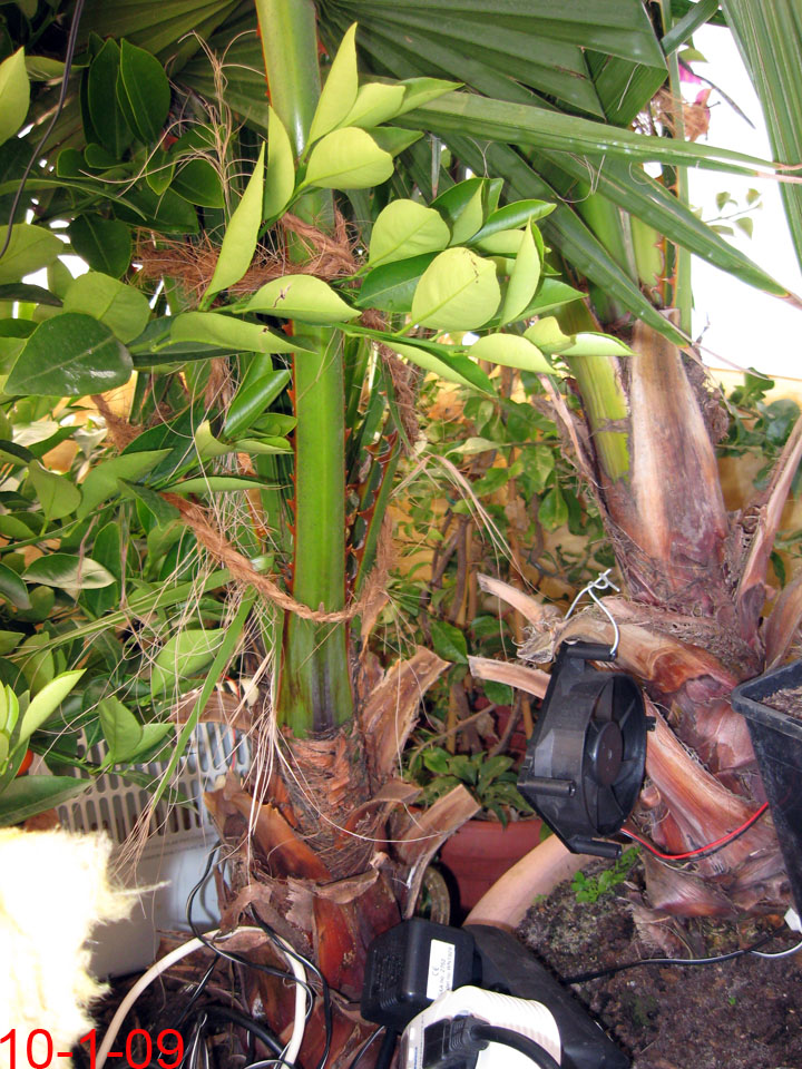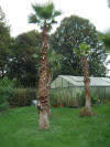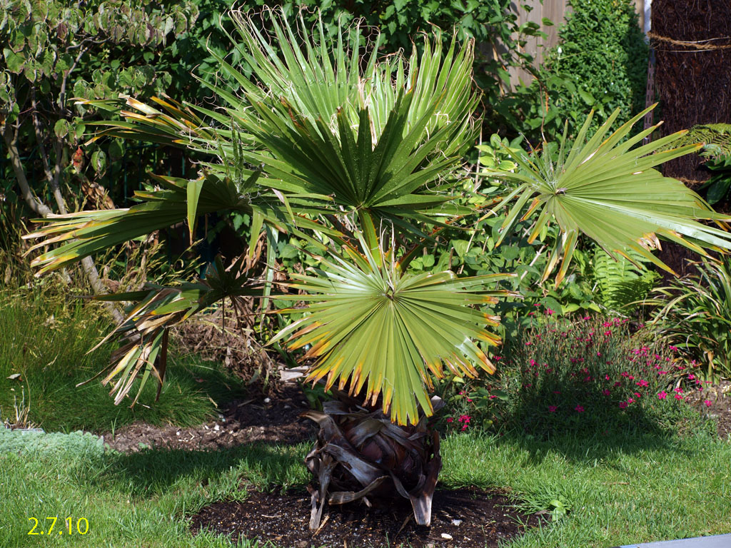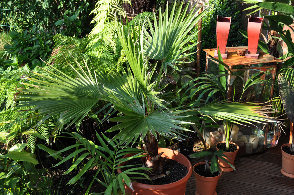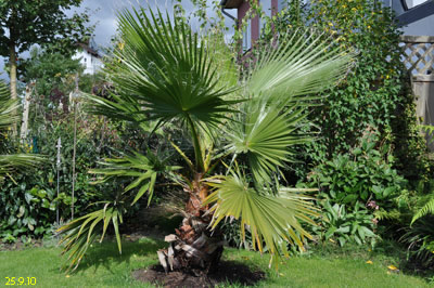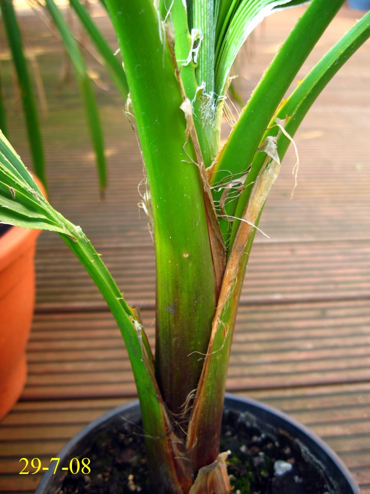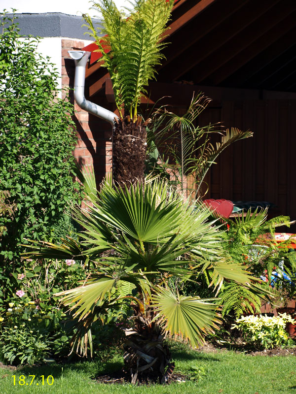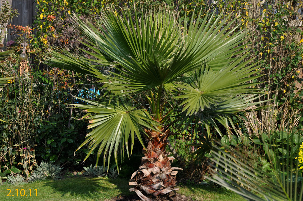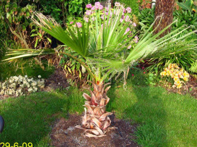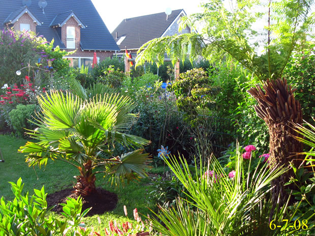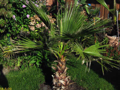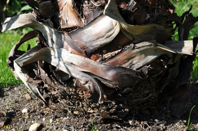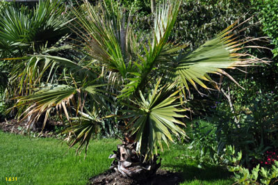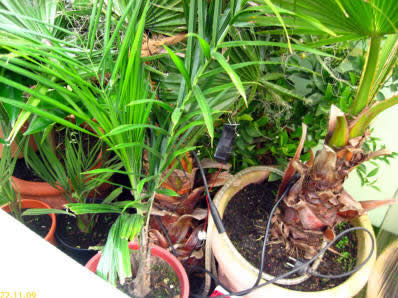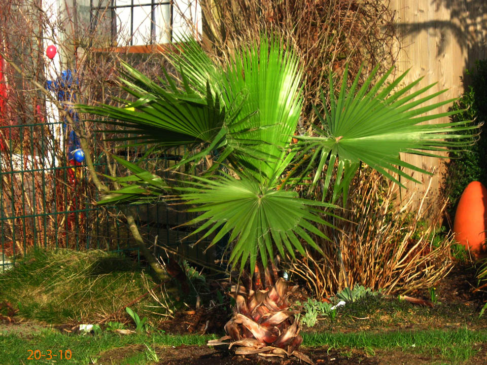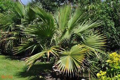 2005/20062007Diese Robusta pflanzte ich im Frühjahr 2007. Bereits in ihrer ersten Wachstumssaison beeindruckte sie mit erstaunlichem Wachstum und brachte es bis zum Herbst auf fast 20 Blätter Zuwachs. Als Winterschutz baute ich ein Gestell, ähnlich der Rosenbogenmethode. Um die Washi besonders gut zu schützen und um Heizkosten zu sparen baute ich einen Schutz im Schutz. Die Außenfolie bestand aus weißer Gewebeplane, innen umbaute ich die zusammengeschnürte Palme zusätzlich mit einem Vlies. Ich dachte, ich könnte so einen Kontakt der Blätter zur Außenfolie auf jeden Fall vermeiden. Leider funktionierte dieser Schutz nicht, obwohl ich bereits ab -3°C die Palme per Heizlüfter beheizte. Problematisch war, dass mir bereits beim Zusammenbinden der Fächer zwei Blätter abgebrochen sind - Washingtoniablätter sind ziemlich starr und brechen leicht, wenn man sie zu sehr zusammendrückt. Dazu kam, dass der doppelte Schutz scheinbar zu luftdicht war. Nachdem sie den Winter zunächst ganz gut überstanden zu haben schien, verschimmelte dann im Frühjahr plötzlich der zentrale Speer, so dass ich die Blätter abschneiden musste. Zum Glück blieb der Speer aber fest und so wuchs der vom Schimmel befallende Speer aus dem Stamm heraus. Zusätzlich zeigten sich an den neuesten Blättern leichte Schäden durch Nährstoffmangel, welche ich auf zu kalte Bodentemperaturen zurückführe. 2008Dennoch erholte sich die Palme bei zunehmender Wärme dank ihres ausgezeichneten Regenerationsvermögens hervorragend. Bereits im Sommer sah die Washingtonia schon wieder sehr gut aus und legte besonders am Stamm ordentlich zu. Mir wurde klar, dass sie zu nah am daneben liegenden Teich gepflanzt war, so dass ein größerer luftiger Winterschutz an dieser Stelle nicht machbar sein würde. Ich entschloss mich deshalb, die Palme noch in diesem Sommer umzupflanzen. Bei dieser nicht ganz leichten Ausbuddelaktion wurden leider eine Menge Wurzeln verletzt, zusätzlich war es zu dieser Zeit sehr warm, so dass am neuen Standort nach und nach die Blätter vertrockneten. Es dauerte fast zwei Monate, bis sich die Washi von dieser Umpflanzung erholte und langsam wieder Wachstum zeigte. Aber zumindest hatte ich nun Platz für einen ausreichend dimensionierten Winterschutz, so dass ich die Blätter nicht zu eng binden brauchte. 2009Der Winter 2008/2009 hatte es in sich mit Tiefstwerten von -16,5°C (2m geschützt gemessen. Dennoch machte die Washi an ihrem neuen Standort mit dem verbesserten Winterschutz einen guten Eindruck. Der Winterschutz bestand aus einer Umbauung aus Gewebeplane, zusätzlich wurde der untere Bereich zusätzlich mit Steinwolle isoliert. Um eine ausreichende Belüftung zu gewährleisten wurde der Schutz stets bei positiven Außentemperaturen geöffnet, dazu war permanent ein auf den zentralen Speer gerichteter PC-Lüfter im Einsatz. Beheizt wurde mit einem Lichtschlauch der sich thermostatgesteuert bei -1,5°C einschaltete. Falls der Lichtschlauch nicht ausgereicht hätte, hätte sich ein sicherheitshalber zusätzlich installierter 400 W Frostwächter im Schutz bei -3°C eingeschaltet . Jedenfalls hatte die Palme im Frühjahr keine sichtbaren Schäden. Allerdings wollte sie zunächst nicht recht wachsen, so dass ich annehme, dass sie doch durch die lange anhaltenden tiefen Bodentemperaturen einen leichten Wurzelschaden abbekommen hatte. Statt neue Blätter zu schieben verlor sie zunächst zwei ältere Blätter die langsam vertrockneten, bis sie dann im Juli plötzlich startete. Von Juli bis zum Ende der Wachstumssaison im Oktober hat sich die Washi dann noch prima entwickelt. Mein Winterschutz 09/10Die Washi steht dieses Jahr in einer Kombination aus Styrodurplatten und alten Doppelstegplatten einer ehem. Terrassenüberdachung. Das Gerüst besteht aus Alugestängen, die etwa 25 cm tief im Boden stecken. Den ersten Sturm hat die Konstruktion heute bereits bestens gemeistert, so dass eine Abspannung überflüssig sein dürfte. Das beste an diesem Schutz ist aber, dass ich eine alte Duschwand auftreiben konnte, die ich als Dach zurecht gesägt habe, so dass ich das Dach nun je nach Bedarf einfach teilweise oder auch komplett öffnen kann. Eine Styrodurplatte an der Seite kann ebenfalls einfach aufgeklappt werden, so dass ich zum Gießen etc. überall gut rankomme. Zur Beheizung habe ich zunächst mal einen Lichtschlauch am Boden verlegt, der einerseits den Boden frostfrei halten soll, andererseits die mit im Schutz untergebrachten Töpfe vor dem Durchfrieren schützt. Zusätzlich steht eine 100W Lampe im Schutz. Mal sehen wie weit ich mit dieser Beheizung komme, denn beheizen will ich die Washi wieder ab -1,5°C. Sollte ich diese Temperatur nicht halten können, installiere ich zusätzlich einen Frostwächter. Ein Ventilator im Inneren sorgt permanent für Luftbewegung, auch wenn der Schutz verschlossen ist. Nach dem ersten Wintereinbruch im Dez. 09 zeigt sich, dass der Schutz sehr effektiv funktioniert. Bei -12,7°C reicht ein Lichtschlauch völlig aus um die Temperatur im Schutz zu halten. 2010Zum ersten Mal scheint es gelungen zu sein die Washi ohne Schaden durch den Winter zu bekommen, obwohl gerade dieser Winter sehr lang war. Zudem hat sich der neue Winterschutz als sehr effektiv erwiesen. Dank Styrodur und Doppelstegplatten reichten ein Lichterschlauch und eine 100W Glühlampe völlig aus den Schutz auf -1,5°C zu halten. Selbst bei tiefen Temperaturen leuchteten die Lämpchen nur für kurze Zeit, so dass nur wenig Strom verbraucht wurde. Wie sich inzwischen herausstellt, hat die Überwinterung auch dieses Jahr wieder nicht reibungslos funktioniert. Nachdem die Palme anfangs noch kerngesund aussah, baute sie ab April stark ab. Die Speere vertrockneten und auch die Blätter begannen braun zu werden. Woran es nun gelegen hat ist die Frage? Ein einziges Mal kam es zu einem Heizungsausfall, als Kinder den Schalter der Stromversorgung versehentlich ausschalteten. Bis ich das bemerkte waren es innerhalb 