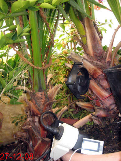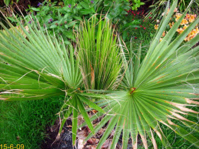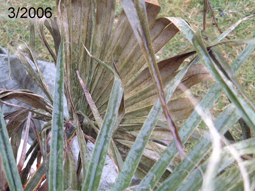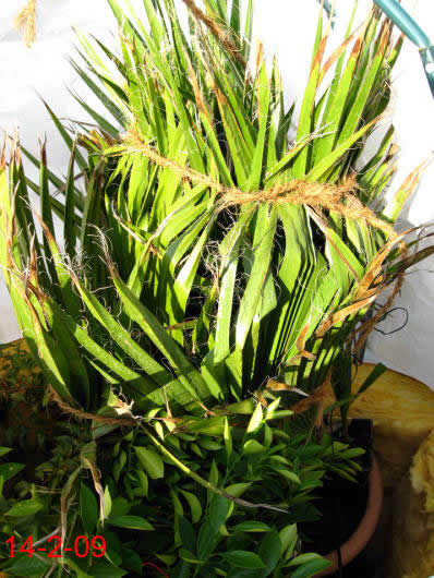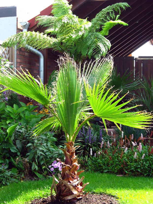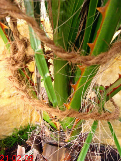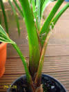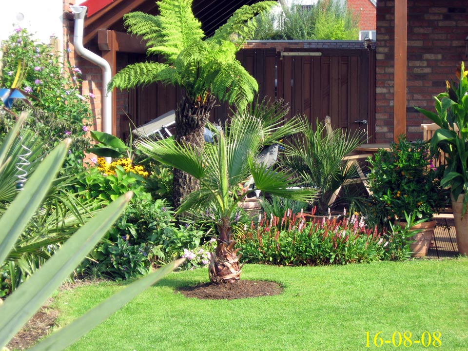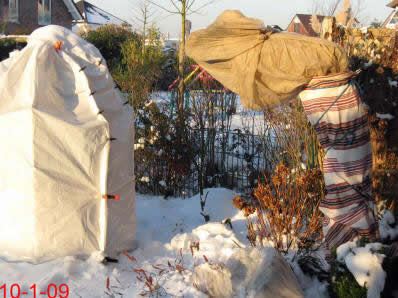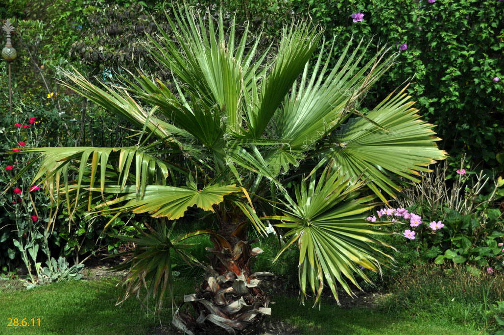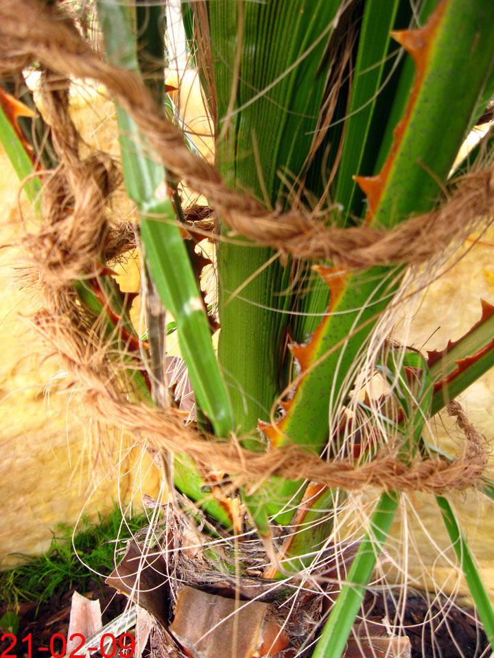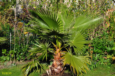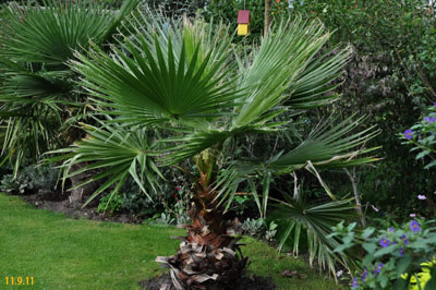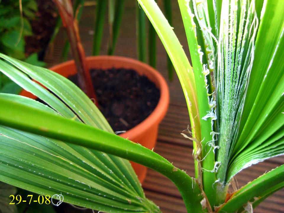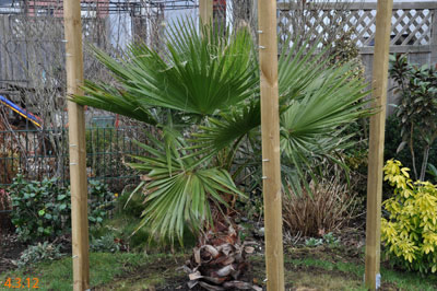 2005/20062007Diese Robusta pflanzte ich im Frühjahr 2007. Bereits in ihrer ersten Wachstumssaison beeindruckte sie mit erstaunlichem Wachstum und brachte es bis zum Herbst auf fast 20 Blätter Zuwachs. Als Winterschutz baute ich ein Gestell, ähnlich der Rosenbogenmethode. Um die Washi besonders gut zu schützen und um Heizkosten zu sparen baute ich einen Schutz im Schutz. Die Außenfolie bestand aus weißer Gewebeplane, innen umbaute ich die zusammengeschnürte Palme zusätzlich mit einem Vlies. Ich dachte, ich könnte so einen Kontakt der Blätter zur Außenfolie auf jeden Fall vermeiden. Leider funktionierte dieser Schutz nicht, obwohl ich bereits ab -3°C die Palme per Heizlüfter beheizte. Problematisch war, dass mir bereits beim Zusammenbinden der Fächer zwei Blätter abgebrochen sind - Washingtoniablätter sind ziemlich starr und brechen leicht, wenn man sie zu sehr zusammendrückt. Dazu kam, dass der doppelte Schutz scheinbar zu luftdicht war. Nachdem sie den Winter zunächst ganz gut überstanden zu haben schien, verschimmelte dann im Frühjahr plötzlich der zentrale Speer, so dass ich die Blätter abschneiden musste. Zum Glück blieb der Speer aber fest und so wuchs der vom Schimmel befallende Speer aus dem Stamm heraus. Zusätzlich zeigten sich an den neuesten Blättern leichte Schäden durch Nährstoffmangel, welche ich auf zu kalte Bodentemperaturen zurückführe. 2008Dennoch erholte sich die Palme bei zunehmender Wärme dank ihres ausgezeichneten Regenerationsvermögens hervorragend. Bereits im Sommer sah die Washingtonia schon wieder sehr gut aus und legte besonders am Stamm ordentlich zu. Mir wurde klar, dass sie zu nah am daneben liegenden Teich gepflanzt war, so dass ein größerer luftiger Winterschutz an dieser Stelle nicht machbar sein würde. Ich entschloss mich deshalb, die Palme noch in diesem Sommer umzupflanzen. Bei dieser nicht ganz leichten Ausbuddelaktion wurden leider eine Menge Wurzeln verletzt, zusätzlich war es zu dieser Zeit sehr warm, so dass am neuen Standort nach und nach die Blätter vertrockneten. Es dauerte fast zwei Monate, bis sich die Washi von dieser Umpflanzung erholte und langsam wieder Wachstum zeigte. Aber zumindest hatte ich nun Platz für einen ausreichend dimensionierten Winterschutz, so dass ich die Blätter nicht zu eng binden brauchte. 2009Der Winter 2008/2009 hatte es in sich mit Tiefstwerten von -16,5°C (2m geschützt gemessen. Dennoch machte die Washi an ihrem neuen Standort mit dem verbesserten Winterschutz einen guten Eindruck. Der Winterschutz bestand aus einer Umbauung aus Gewebeplane, zusätzlich wurde der untere Bereich zusätzlich mit Steinwolle isoliert. Um eine ausreichende Belüftung zu gewährleisten wurde der Schutz stets bei positiven Außentemperaturen geöffnet, dazu war permanent ein auf den zentralen Speer gerichteter PC-Lüfter im Einsatz. Beheizt wurde mit einem Lichtschlauch der sich thermostatgesteuert bei -1,5°C einschaltete. Falls der Lichtschlauch nicht ausgereicht hätte, hätte sich ein sicherheitshalber zusätzlich installierter 400 W Frostwächter im Schutz bei -3°C eingeschaltet . Jedenfalls hatte die Palme im Frühjahr keine sichtbaren Schäden. Allerdings wollte sie zunächst nicht recht wachsen, so dass ich annehme, dass sie doch durch die lange anhaltenden tiefen Bodentemperaturen einen leichten Wurzelschaden abbekommen hatte. Statt neue Blätter zu schieben verlor sie zunächst zwei ältere Blätter die langsam vertrockneten, bis sie dann im Juli plötzlich startete. Von Juli bis zum Ende der Wachstumssaison im Oktober hat sich die Washi dann noch prima entwickelt. Mein Winterschutz 09/10Die Washi steht dieses Jahr in einer Kombination aus Styrodurplatten und alten Doppelstegplatten einer ehem. Terrassenüberdachung. Das Gerüst besteht aus Alugestängen, die etwa 25 cm tief im Boden stecken. Den ersten Sturm hat die Konstruktion heute bereits bestens gemeistert, so dass eine Abspannung überflüssig sein dürfte. Das beste an diesem Schutz ist aber, dass ich eine alte Duschwand auftreiben konnte, die ich als Dach zurecht gesägt habe, so dass ich das Dach nun je nach Bedarf einfach teilweise oder auch komplett öffnen kann. Eine Styrodurplatte an der Seite kann ebenfalls einfach aufgeklappt werden, so dass ich zum Gießen etc. überall gut rankomme. Zur Beheizung habe ich zunächst mal einen Lichtschlauch am Boden verlegt, der einerseits den Boden frostfrei halten soll, andererseits die mit im Schutz untergebrachten Töpfe vor dem Durchfrieren schützt. Zusätzlich steht eine 100W Lampe im Schutz. Mal sehen wie weit ich mit dieser Beheizung komme, denn beheizen will ich die Washi wieder ab -1,5°C. Sollte ich diese Temperatur nicht halten können, installiere ich zusätzlich einen Frostwächter. Ein Ventilator im Inneren sorgt permanent für Luftbewegung, auch wenn der Schutz verschlossen ist. Nach dem ersten Wintereinbruch im Dez. 09 zeigt sich, dass der Schutz sehr effektiv funktioniert. Bei -12,7°C reicht ein Lichtschlauch völlig aus um die Temperatur im Schutz zu halten. 2010Zum ersten Mal scheint es gelungen zu sein die Washi ohne Schaden durch den Winter zu bekommen, obwohl gerade dieser Winter sehr lang war. Zudem hat sich der neue Winterschutz als sehr effektiv erwiesen. Dank Styrodur und Doppelstegplatten reichten ein Lichterschlauch und eine 100W Glühlampe völlig aus den Schutz auf -1,5°C zu halten. Selbst bei tiefen Temperaturen leuchteten die Lämpchen nur für kurze Zeit, so dass nur wenig Strom verbraucht wurde. Wie sich inzwischen herausstellt, hat die Überwinterung auch dieses Jahr wieder nicht reibungslos funktioniert. Nachdem die Palme anfangs noch kerngesund aussah, baute sie ab April stark ab. Die Speere vertrockneten und auch die Blätter begannen braun zu werden. Woran es nun gelegen hat ist die Frage? Ein einziges Mal kam es zu einem Heizungsausfall, als Kinder den Schalter der Stromversorgung versehentlich ausschalteten. Bis ich das bemerkte waren es innerhalb 