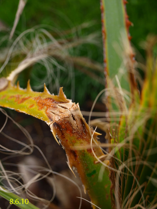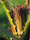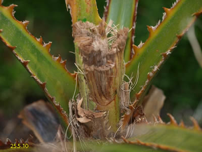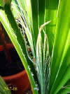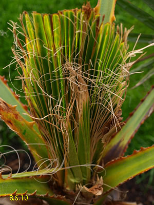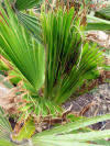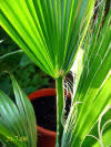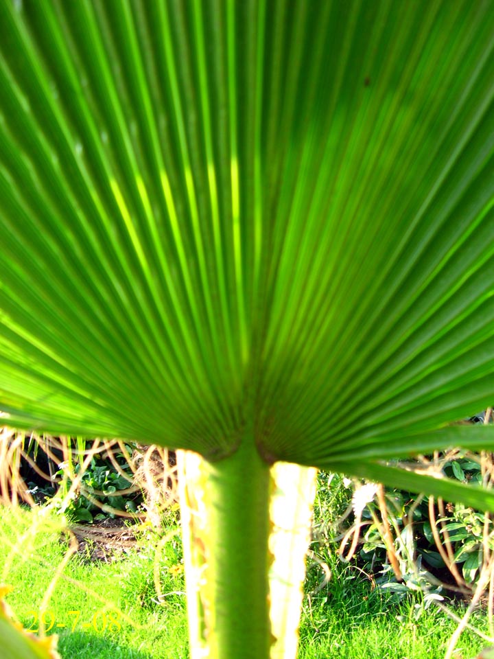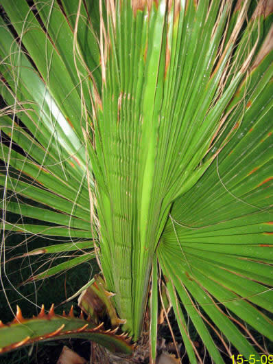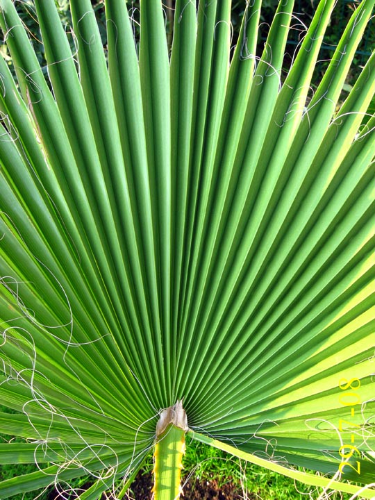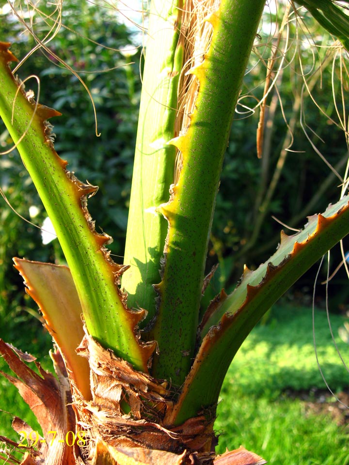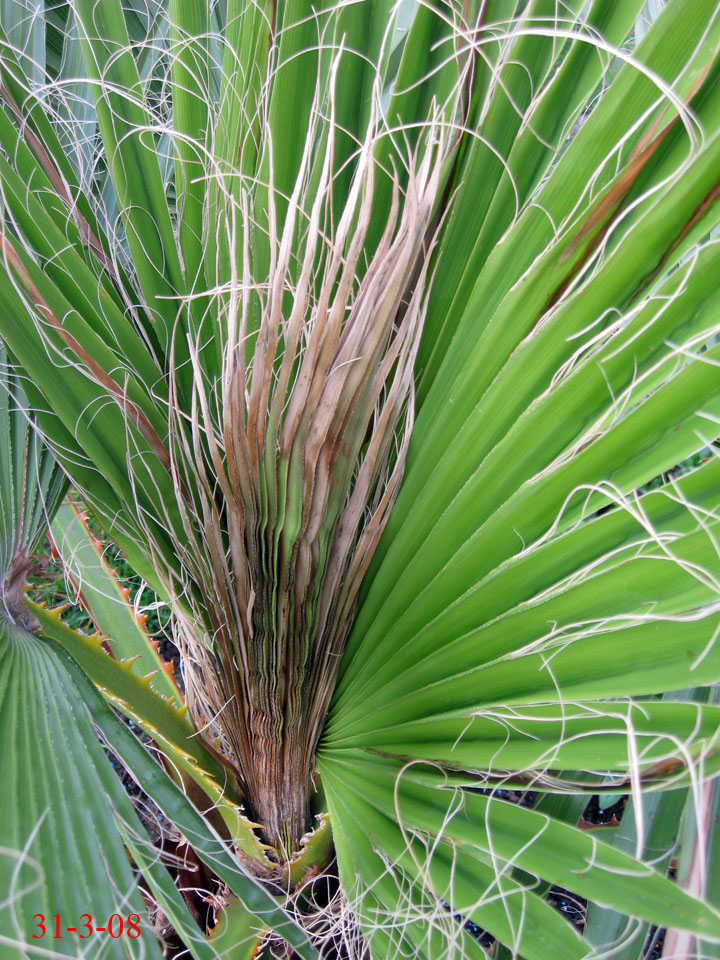 WASHINGTONIAWashingtonia robusta - Washingtonia filiferaWashingtonia robustaIhren Namen verdankt diese Palme dem Umstand, dass diese bis 40m hoch werdende Fächerpalme ihre abgestorbenen Blätter nicht abwirft, sondern dass die alten Wedel sich nach unten neigen und dadurch einen Petticoat um den Stamm bilden. Erst im Alter werfen Washis diesen Petticoat ab und geben den Stamm frei. Das natürliche Verbreitungsgebiet dieser schönen Palme mit ihren glänzend grünen, für eine Fächerpalme recht weichen Blättern, liegt in Wüstengebieten im Nordwesten Mexikos. Allerdings sollte man sich dadurch nicht täuschen lassen. Der Wasserbedarf dieser Palme ist recht hoch, deshalb kommt sie bevorzugt dort vor, wo sie unterirdische Wasservorkommen findet, oder in der Nähe von Bächen oder Flüssen. Sie bildet ein weit verzweigtes und sehr tiefreichendes Wurzelsystem um an Wasser zu gelangen. Findet sie gute Bedingungen vor - ausreichend Wasser und Nährstoffe - gehört sie zu den am schnellsten wachsenden Palmen. Diesem Umstand hat sie es wohl zu verdanken, dass sie heute zu den am häufigsten kultivierten Palmen in subtropischen bis tropischen Gebieten zählt. Selbst an oberitalienischen Seen oder auch in England findet man einige stattliche Exemplare. Hier bei uns ist diese Palme leider nur mit sehr gutem und beheizbarem Winterschutz auspflanzbar. Da W. robusta aber selbst in unserem kühlen Klima noch sehr gut wächst, ist eine Auspflanzung nur von relativ kurzer Dauer, da man mit dem Winterschutz recht schnell an die Grenzen des Möglichen stößt. Dennoch habe ich selbst eine Robusta bei mir im Garten gepflanzt, gerade weil das enorme Wachstum geradezu beeindruckend ist, wenn man ihr einen sehr sonnigen, warmen Platz gönnt und sie mit reichlich Wasser versorgt. Der Winterschutz dieser Palme gestaltet sich recht schwierig, da man einen möglichst großen Schutz benötigt. Die Blätter sollten einigen Abstand zur Folie haben, da es sonst schnell zu Erfrierungen mit anschließender Schimmelbildung kommt. Meine ersten Versuche mit dieser Palme sind kläglich gescheitert, weil junge Pflanzen wahrlich nur sehr geringen Frost vertragen. Bereits bei -3°C kommt es bei jüngeren W. robustas zu Blattschäden (ältere Washingtonien sollen auch Temperaturen bis etwa -6°C aushalten, kurzfristig sogar noch tiefere Temperaturen), die dann schnell zu schimmeln beginnen. Eine sehr gute Belüftung des Winterschutzes ist unerlässlich. Dieses Jahr ist meine Washingtonia sehr gut über den Winter gekommen, was ich unter anderem auch darauf zurückführe, dass ich zum einen den Wurzelbereich sehr gut gemulcht habe und einen Lichtschlauch als Heizung auf diesen Mulch gelegt habe, der bereits ab -1,5°C eingeschaltet wurde. Für den Fall, dass der Lichterschlauch zur Beheizung nicht ausreicht, hatte ich zusätzlich einen Frostwächter im Schutz, der sich bei -3°C dazu geschaltet hätte. Ein PC-Lüfter war während des gesamten Winters im Dauereinsatz um im Schutz die Luft umzuwälzen. Da es wegen der frühzeitigen Beheizung keine Schäden gab, hatte ich dieses Jahr dann auch erstmalig keine Probleme mit Schimmelbildung. Nun bin ich gespannt, wie sich diese Washi nach der guten Überwinterung im Sommer verhält. Im Jahr der Auspflanzung erreichte diese Washi bereits fast 20 Blätter in ihrer ersten Wachstumsperiode im Freiland. Die Unterscheidung zwischen W. robusta und W. filifera ist besonders bei Jungpflanzen sehr schwierig. Oft werden Washingtonien deshalb unter falschem Namen verkauft. Fast alle hier erhältlichen Pflanzen sind W. robustas, wahrscheinlich, weil sie wesentlich schneller wachsen als die hier nur selten zu bekommende W. filifera. W.robusta hat meistens eher rötlich bis braune starke Dornen an den Blattstielen, während W. filifera meistens eher grünliche und viel kleinere Dornen bildet. Der Stamm einer W. robusta wird höher und hat dabei einen geringeren Umfang als der Stamm der W. filifera, die zwar kleiner bleibt, aber wegen des dicken Stammes mächtiger wirkt. Die Blattbasen sollen bei Robustas rötlich sein, im Gegensatz zur Filifera und auch die Blattfarbe unterscheidet sich etwas (die Blätter der robusta sind intensiver grün, die der Filifera etwas matter). Auch der Übergang vom Blattstiel zur Blattspreite unterscheidet sich etwas, wie weiter unten auf den Bildern zu sehen ist. Da die zwittrig blühenden Washis scheinbar recht einfach hybridisieren kommen eventuell auch viele Mischformen zustande, so dass eine Unterscheidung noch schwieriger wird. Kreuzungen zwischen diesen beiden Arten werden als W. filibusta verkauft. Diese noch junge Washingtonia robusta pflanzte ich 2005 im Garten aus. Der Winterschutz bestand aus einem Vlies und innerhalb des Vlieses hatte ich eine 60W Glühbirne als Heizung aufgestellt. Nach nur -3,8°C zeigten sich bereits schwere Blattschäden, die ich unter anderem darauf zurückführe, dass die Blätter Kontakt zum Vlies hatten. Bereits kurz darauf verschimmelten alle Blätter und im Frühjahr ließen sich alle Speere ziehen. Nachdem die Palme im Sommer noch einmal kurz austrieb verkümmerte sie dann doch und starb.